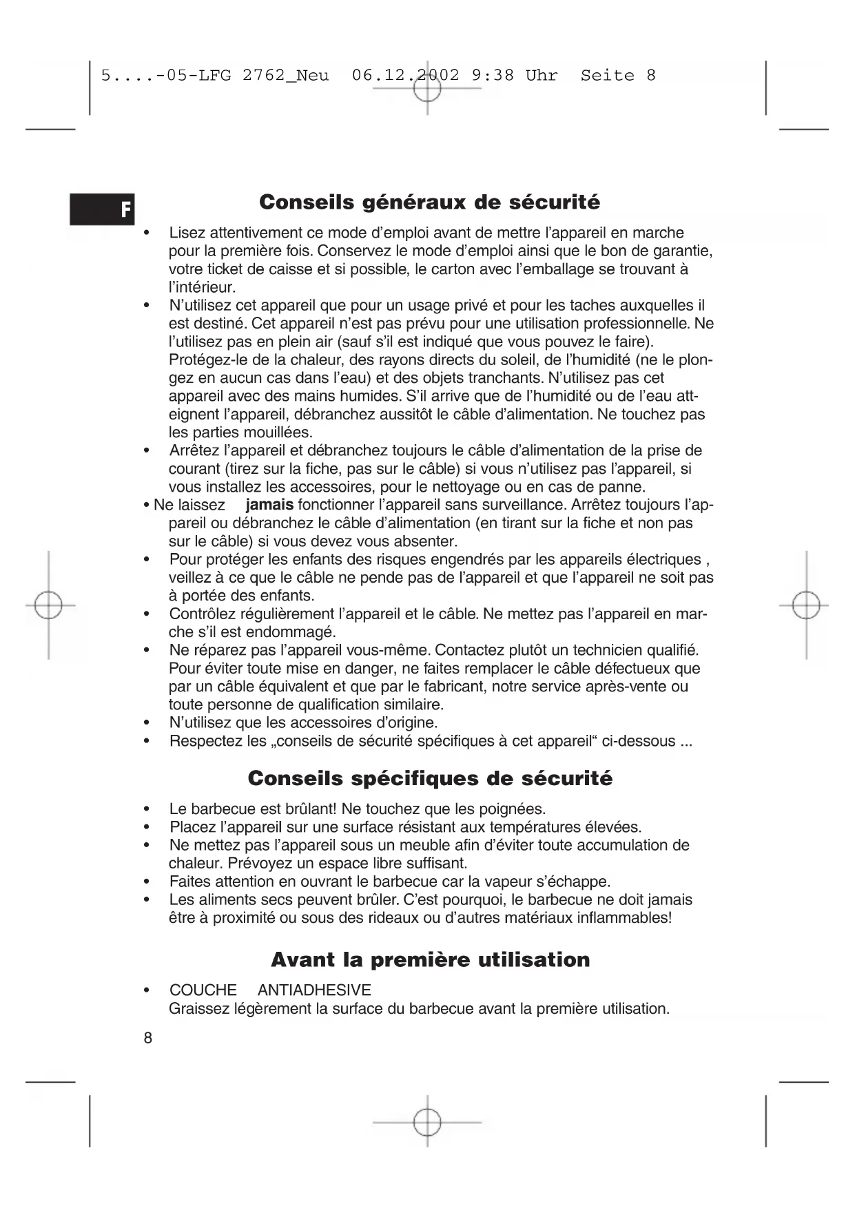 5....-05-LFG 2762_Neu 06.12.2002 9:38 Uhr Seite 8Utiliser l’appareil env. 10 minutes sans aliments en veillant à ce que les surfa- ces du barbecue soient fermées (voir utilisation de l’appareil). Nettoyer ensuite avec un chiffon humide. Utilisation de l’appareil