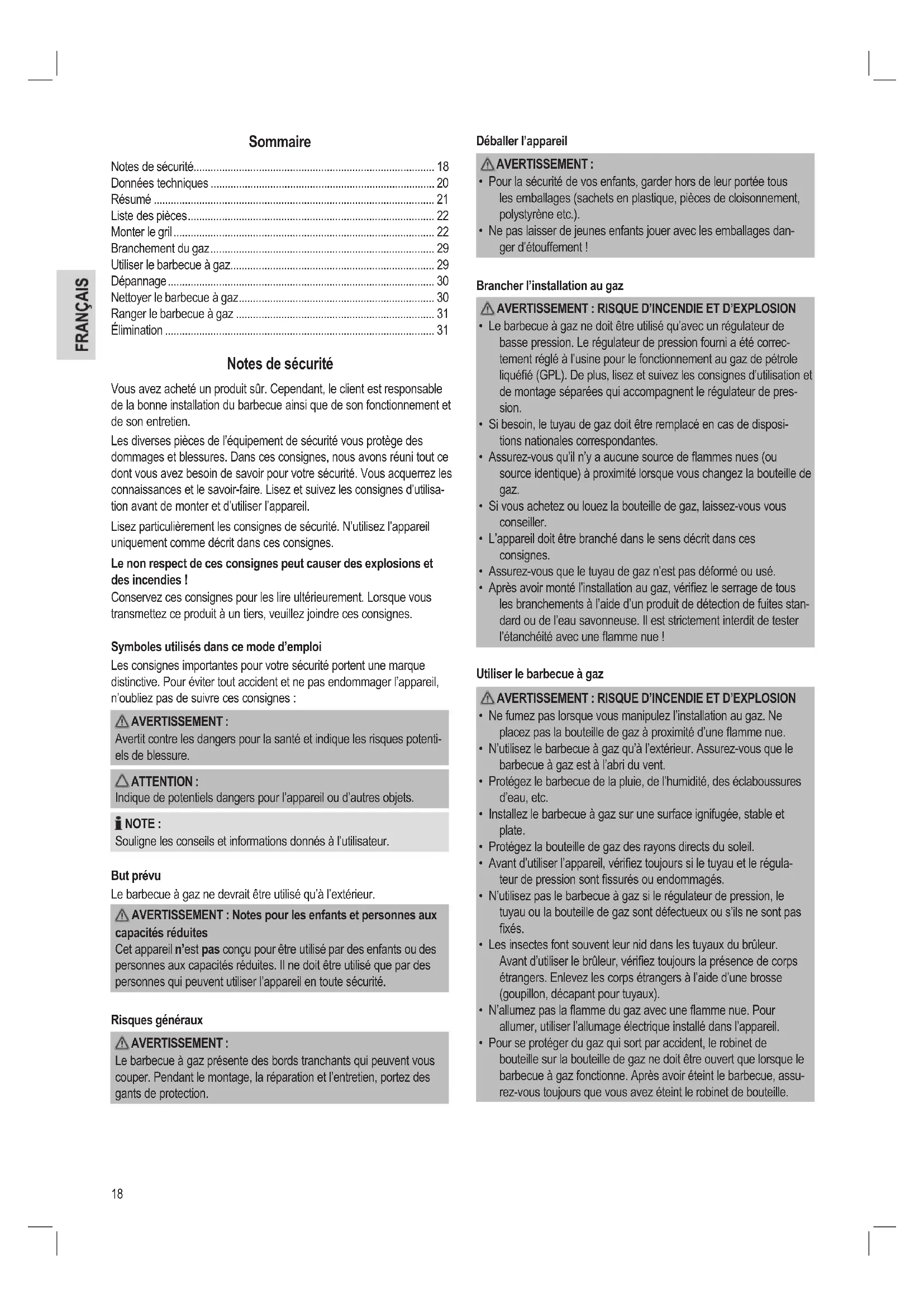 Avertit contre les dangers pour la santé et indique les risques potenti- els de blessure. ATTENTION : Indique de potentiels dangers pour l’appareil ou d’autres objets. NOTE : Souligne les conseils et informations donnés à l’utilisateur. But prévu Le barbecue à gaz ne devrait être utilisé qu’à l’extérieur.