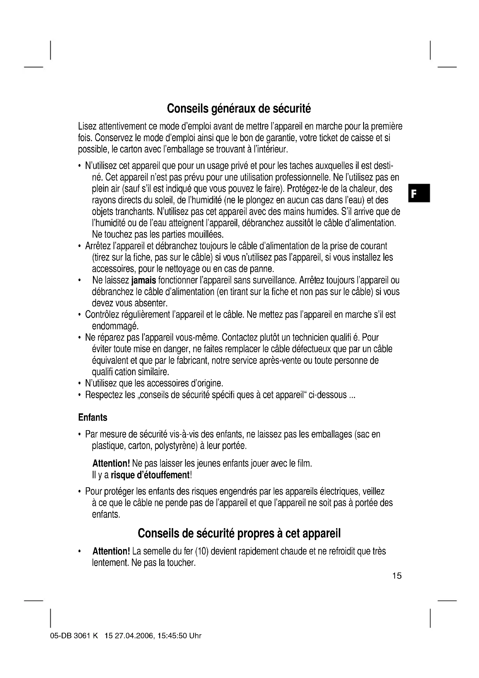 - Attention! La semelle du fer (10) devient rapidement chaude et ne refroidit que très lentement. Ne pas la toucher. 05-DB 3061 K 15 27.04.2006, 15:45:50 UhrF
