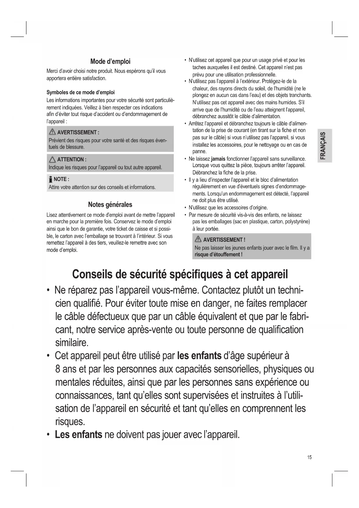 Prévient des risques pour votre santé et des risques éven- tuels de blessure. ATTENTION : Indique les risques pour l’appareil ou tout autre appareil. NOTE : Attire votre attention sur des conseils et informations. Notes générales Lisez attentivement ce mode d’emploi avant de mettre l’appareil en marche pour la première fois. Conservez le mode d’emploi ainsi que le bon de garantie, votre ticket de caisse et si possi- ble, le carton avec l’emballage se trouvant à l’intérieur. Si vous remettez l’appareil à des tiers, veuillez-le remettre avec son mode d’emploi. Conseils de sécurité spéciques à cet appareil