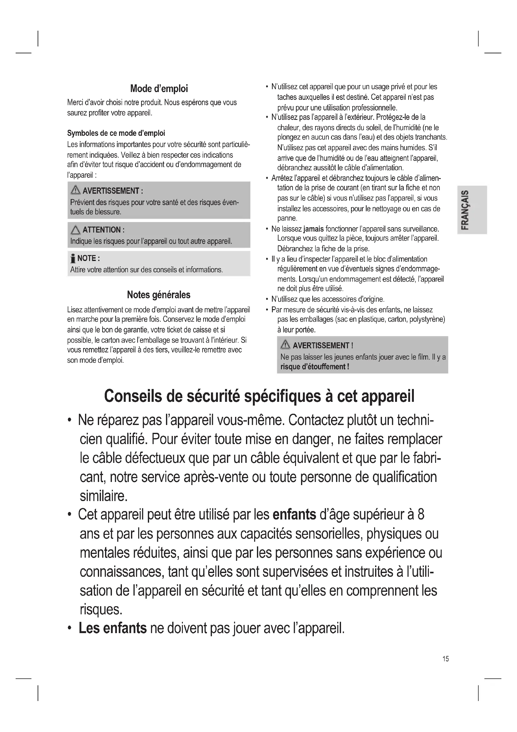 - Les enfants ne doivent pas jouer avec l’appareil.16