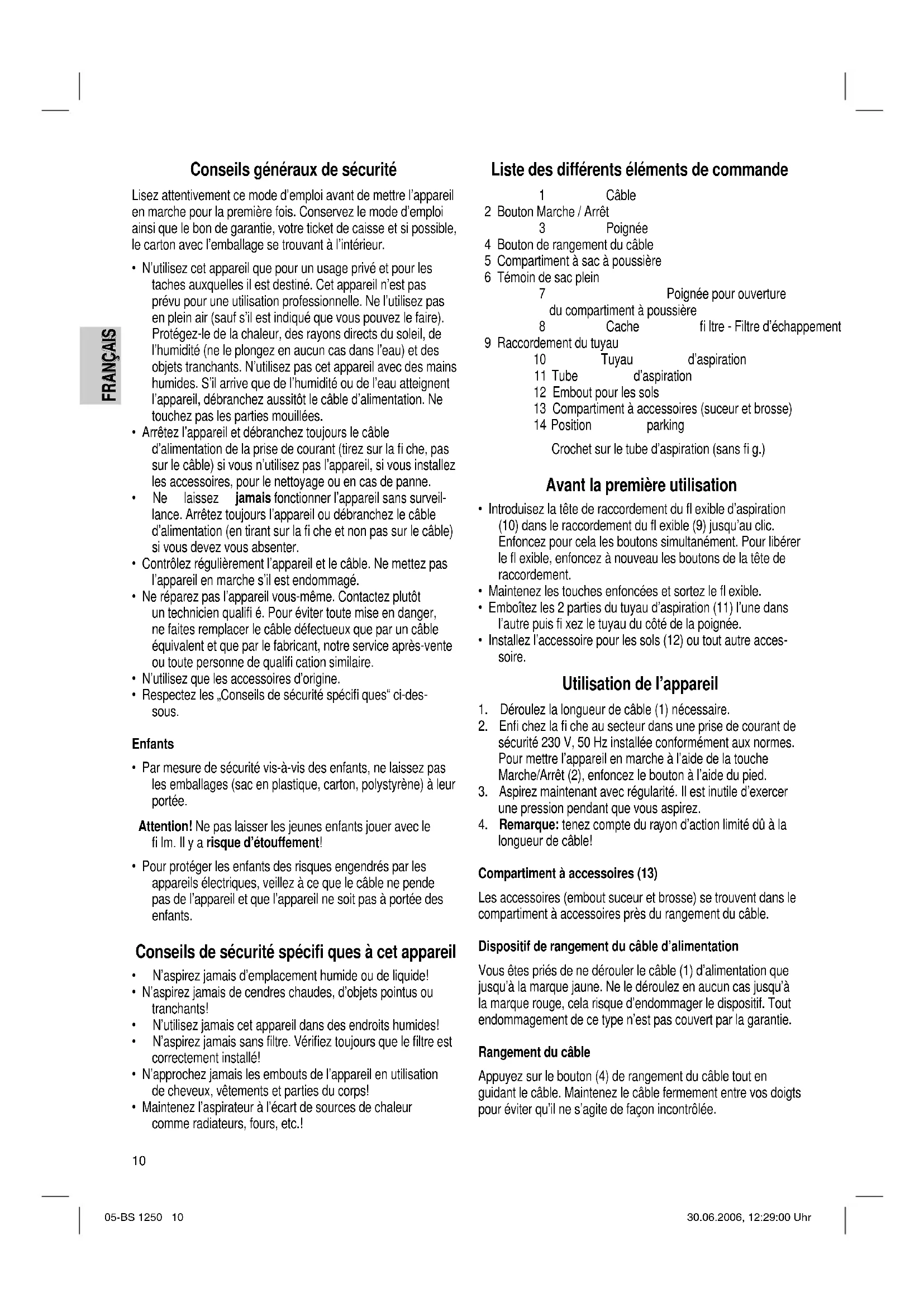 longueur de câble! Compartiment à accessoires (13) Les accessoires (embout suceur et brosse) se trouvent dans le compartiment à accessoires près du rangement du câble. Dispositif de rangement du câble d’alimentation Vous êtes priés de ne dérouler le câble (1) d’alimentation que jusqu’à la marque jaune. Ne le déroulez en aucun cas jusqu’à la marque rouge, cela risque d’endommager le dispositif. Tout endommagement de ce type n’est pas couvert par la garantie. Rangement du câble Appuyez sur le bouton (4) de rangement du câble tout en guidant le câble. Maintenez le câble fermement entre vos doigts pour éviter qu’il ne s’agite de façon incontrôlée. 05-BS 1250 10 30.06.2006, 12:29:00 UhrFRANÇAIS
