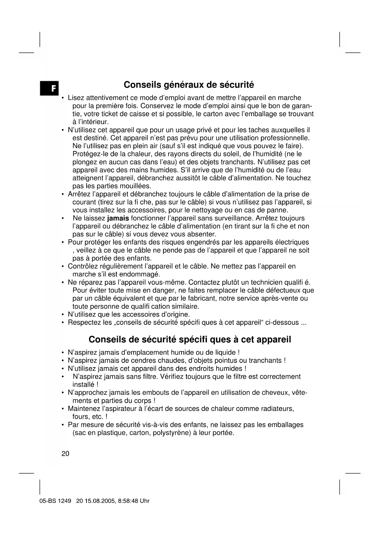 - Par mesure de sécurité vis-à-vis des enfants, ne laissez pas les emballages (sac en plastique, carton, polystyrène) à leur portée. 05-BS 1249 20 15.08.2005, 8:58:48 UhrF