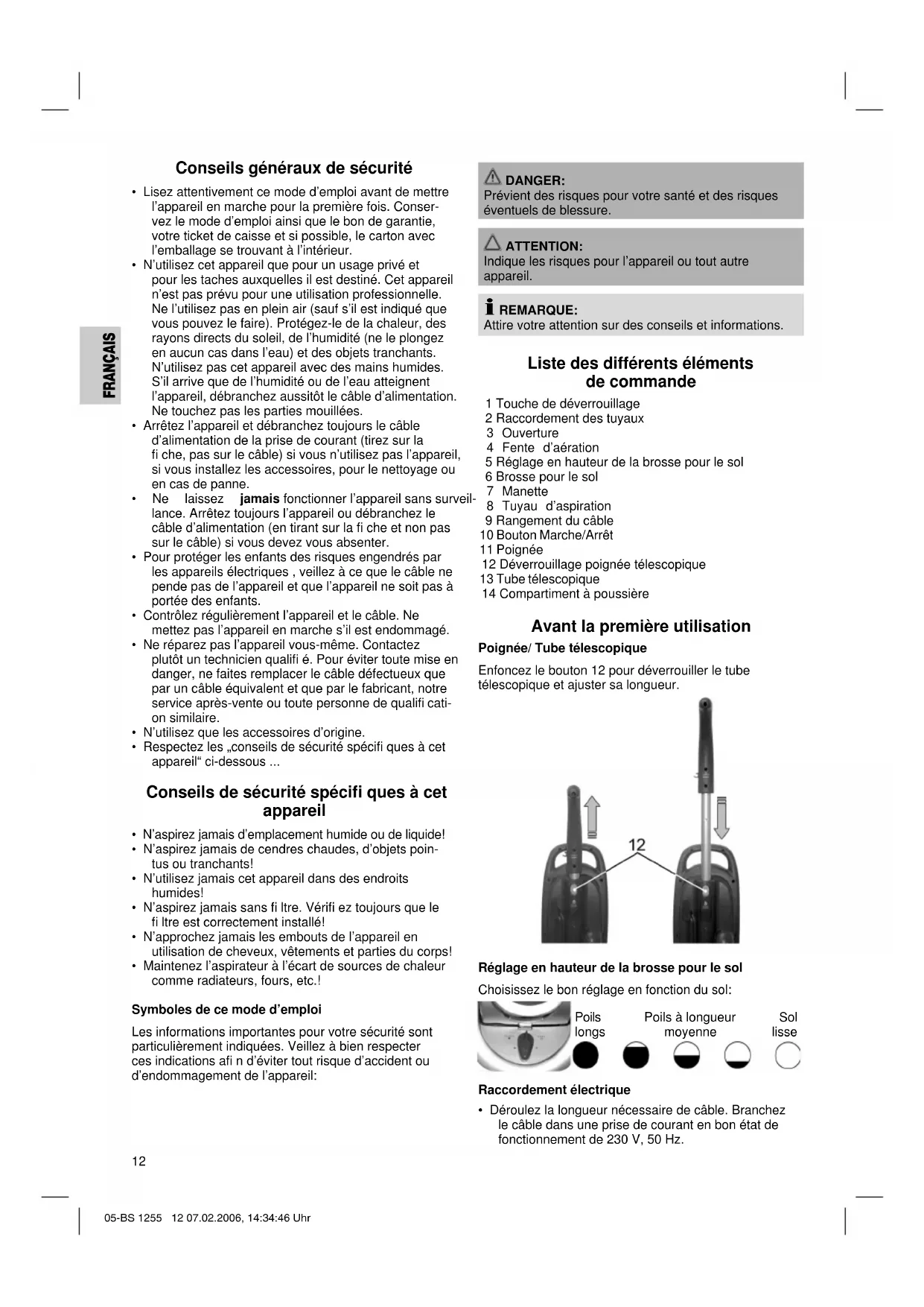 Prévient des risques pour votre santé et des risques éventuels de blessure. ATTENTION: Indique les risques pour l’appareil ou tout autre appareil. REMARQUE: Attire votre attention sur des conseils et informations. Liste des différents éléments de commande 1 Touche de déverrouillage 2 Raccordement des tuyaux 3 Ouverture 4 Fente d’aération 5 Réglage en hauteur de la brosse pour le sol 6 Brosse pour le sol 7 Manette 8 Tuyau d’aspiration 9 Rangement du câble 10 Bouton Marche/Arrêt 11 Poignée 12 Déverrouillage poignée télescopique 13 Tube télescopique 14 Compartiment à poussière Avant la première utilisation Poignée/ Tube télescopique Enfoncez le bouton 12 pour déverrouiller le tube télescopique et ajuster sa longueur. Réglage en hauteur de la brosse pour le sol Choisissez le bon réglage en fonction du sol: Poils longs Poils à longueur moyenne Sol lisse Raccordement électrique
