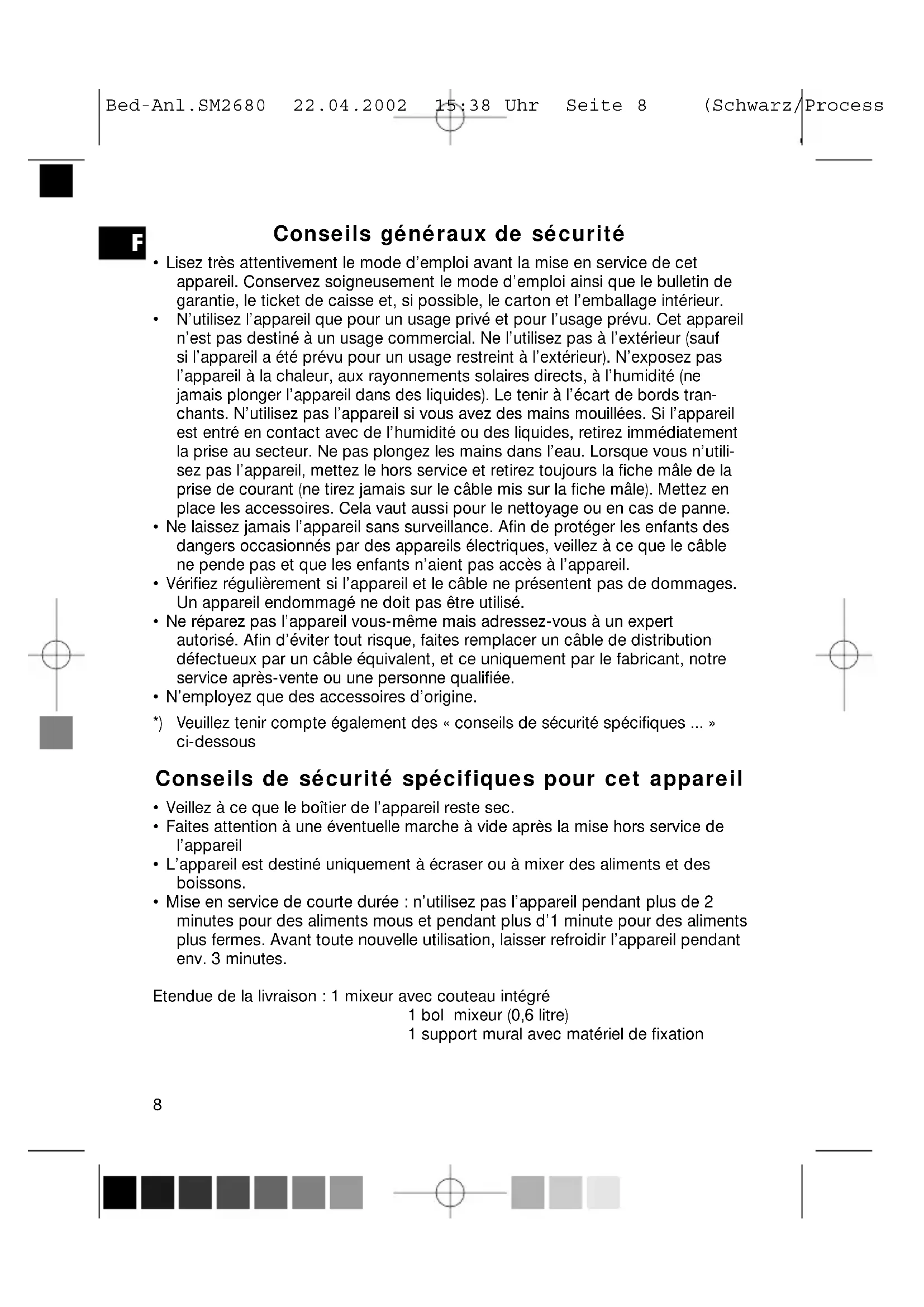 Bed-Anl.SM2680 22.04.2002 15:38 Uhr Seite 9 (Schwarz/Process10 Garantie Nous accordons une garantie de 24 mois pour l’appareil que nous vendons, et ce à compter de la date d’achat (ticket de caisse). Pendant la durée de garantie, nous éliminons gratuitement les défauts de l’appareil ou des accessoires*) en les réparant ou, à notre convenance, en échangeant l’appareil, dans la mesure où ces défauts reposent sur des problèmes liés au matériel ou à la fabrication. Les prestations effectuées dans le cadre de la garantie n’entraînent pas une prorogation de la durée de garantie et ne donnent pas droit à un renouvellement de la durée de garantie ! Le ticket de caisse fait office de preuve pour la garantie. Sans cette preuve, nous ne pouvons pas effectuer d’échange ou de réparation gratuite. En cas de prestation à effectuer dans le cadre de la garantie, nous vous prions de bien vouloir remettre l’appareil complet dans l’emballage d’origine ainsi que le ticket de caisse au commerçant chez qui vous l’avez acheté. *) les accessoires sont soumis à une obligation légale de fournir une garantie (6 mois) et n’entraînent pas un échange gratuit complet de l’ensemble de l’appareil. Dans ce cas, veuillez vous adresser à notre service téléphonique ! Le remplacement de pièces endommagées suite à des bris de verre ou des bris de pièces en matière plastique sont toujours payants ! Les défauts constatés sur des accessoires d’usage courant ou des pièces d’usure (par exemple les charbons du moteur, les crochets de malaxage, les courroies de transmission, la télécommande de remplacement, les brosses à dent de remplacement, les lames de scie etc.), le nettoyage, la maintenance ou l’échange de pièces d’usure ne tombent pas sous le coup de la garantie et sont donc payants ! La garantie prend fin si un tiers a effectué des opérations quelconques sur l’appareil. Après la durée de garantie Lorsque la garantie est arrivée à échéance, les réparations peuvent être effectuées moyennant paiement par les commerçants spécialisés ou le service de réparation.