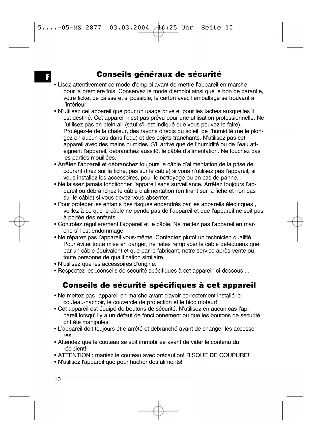 5....-05-MZ 2877 03.03.2004 16:25 Uhr Seite 10• Cet appareil ne convient que pour hacher de petites quantités! Ne remplissez donc l'appareil que dans les quantités maximum indiquées dans le tableau fourni avec l'appareil!
