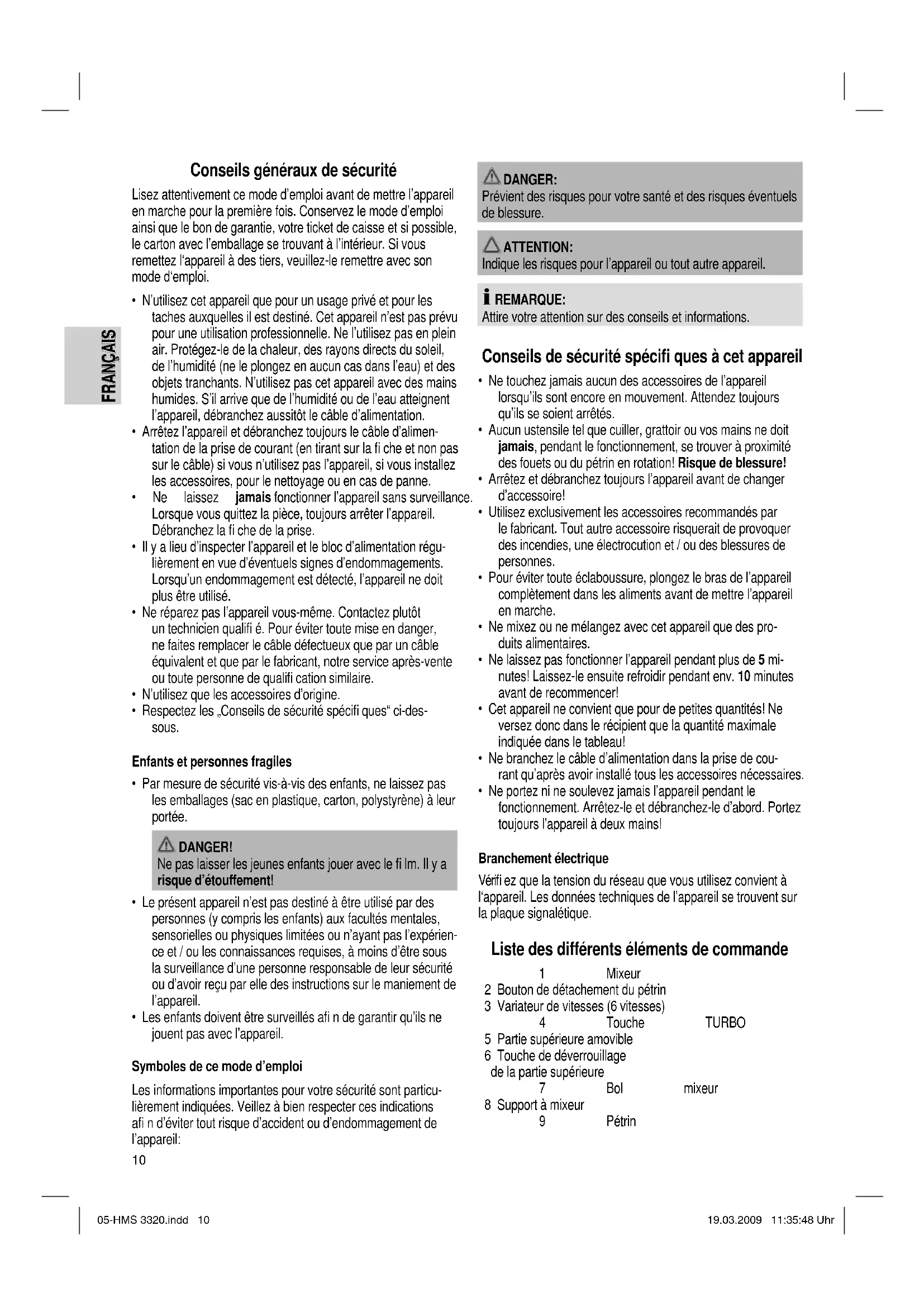 - Vous pouvez laver les pièces salies par la pâte (accessoire à pétrir et bol mélangeur) normalement à l’eau savonneuse. Données techniques Modèle:......................................................................... HMS 3320 Alimentation: .............................................................230 V, 50 Hz Consommation: ...................................................................220 W Classe de protection: .................................................................. ΙΙ Poids net: ..........................................................................1,60 kg Cet appareil a été contrôlé d’après toutes les directives euro- péennes actuelles applicables, comme par exemple concernant la compatibilité électromagnétique et la basse tension. Cet ap- pareil a été fabriqué en respect des réglementations techniques de sécurité les plus récentes. Sous réserve de modifi cations techniques. 05-HMS 3320.indd 1105-HMS 3320.indd 11 19.03.2009 11:35:48 Uhr19.03.2009 11:35:48 Uhr12 FRANÇAIS FRANÇAIS Signifi cation du symbole „Elimination“ Protégez votre environnement, ne jetez pas vos appareils électriques avec les ordures ménagères. Utilisez, pour l’élimination de vos appareils électriques, les bornes de collecte prévues à cet effet où vous pouvez vous débarrasser des appareils que vous n’utilisez plus. Vous contribuez ainsi à éviter les impacts potentiels dans l’envi- ronnement et sur la santé de chacun, causés par une mauvaise élimination de ces déchets. Vous contribuez aussi au recyclage sous toutes ses formes des appareils électriques et électroniques usagés. Vous trouverez toutes les informations sur les bornes d’élimina- tion des appareils auprès de votre commune ou de l’administra- tion de votre communauté. 05-HMS 3320.indd 1205-HMS 3320.indd 12 19.03.2009 11:35:49 Uhr19.03.2009 11:35:49 Uhr13 ESPAÑOL ESPAÑOL Indicaciones generales de seguridad Antes de la puesta en servicio de este aparato lea detenida- mente el manual de instrucciones y guarde éste bien incluido la garantía, el recibo de pago y si es posible también el cartón de embalaje con el embalaje interior. En caso de dejar el aparato a terceros, también entregue el manual de instrucciones.