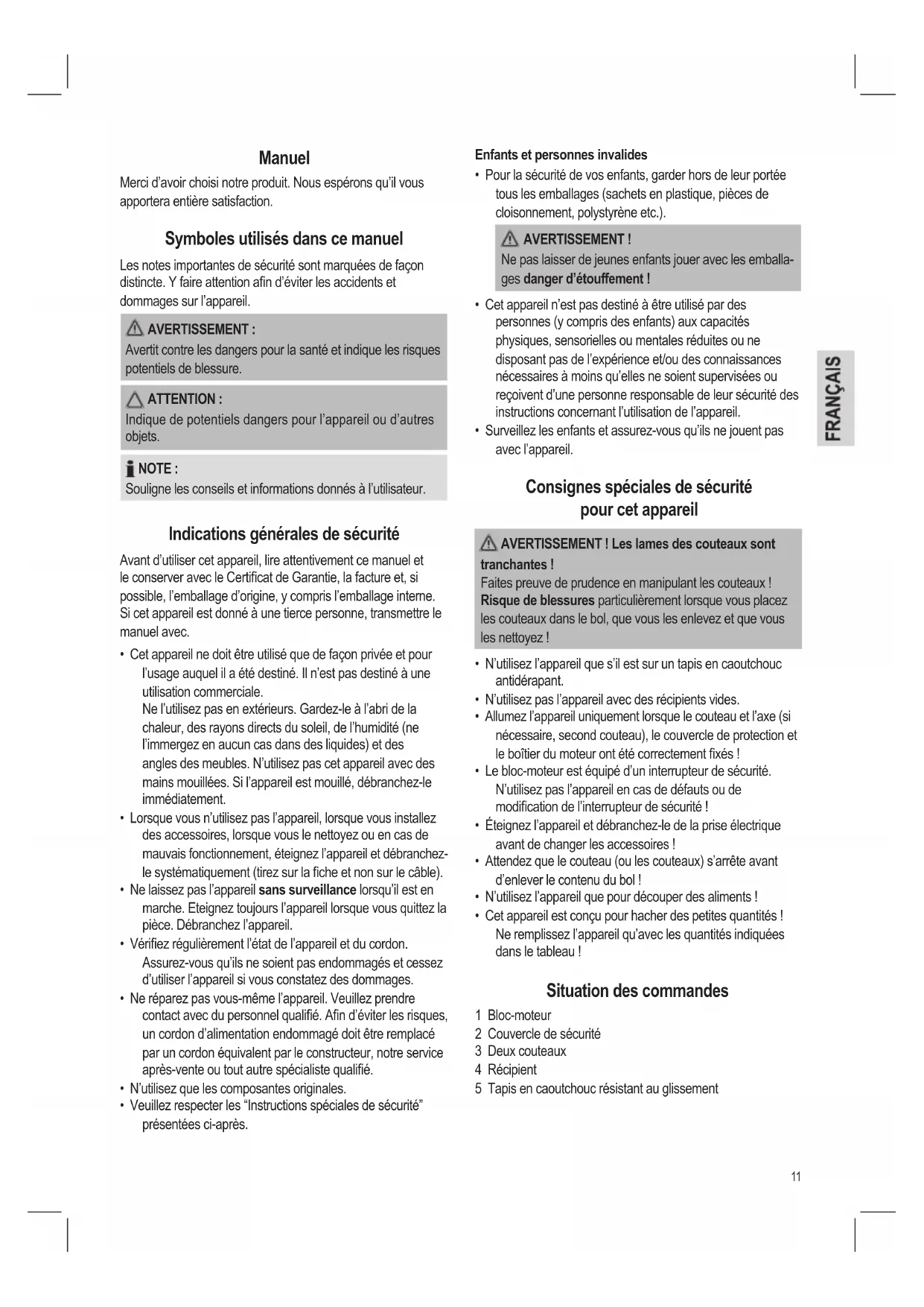 - Cet appareil est conçu pour hacher des petites quantités ! Ne remplissez l’appareil qu’avec les quantités indiquées dans le tableau ! Situation des commandes 1 Bloc-moteur 2 Couvercle de sécurité 3 Deux couteaux 4 Récipient 5 Tapis en caoutchouc résistant au glissement Manuel Merci d’avoir choisi notre produit. Nous espérons qu’il vous apportera entière satisfaction. Symboles utilisés dans ce manuel Les notes importantes de sécurité sont marquées de façon distincte. Y faire attention an d’éviter les accidents et dommages sur l’appareil.
