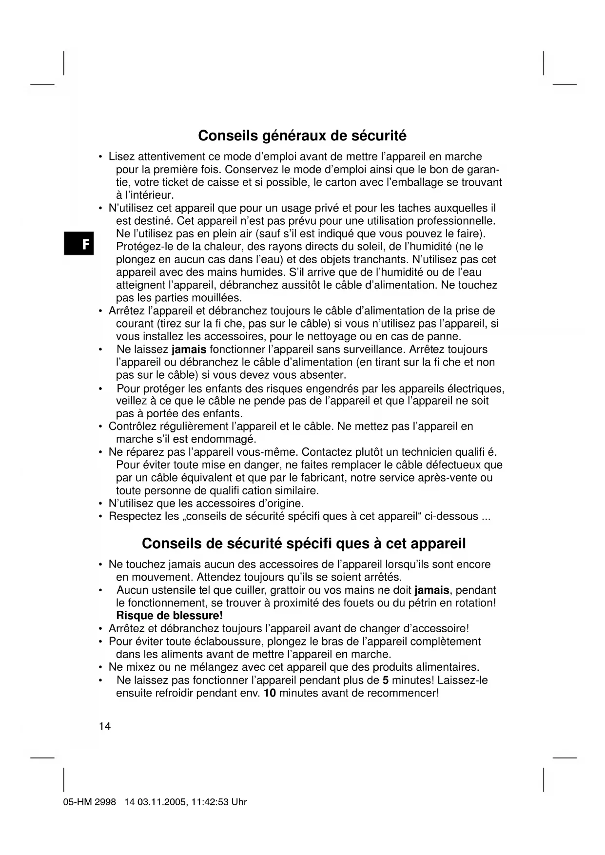 - Ne laissez pas fonctionner l’appareil pendant plus de 5 minutes! Laissez-le ensuite refroidir pendant env. 10 minutes avant de recommencer! 05-HM 2998 14 03.11.2005, 11:42:53 UhrF