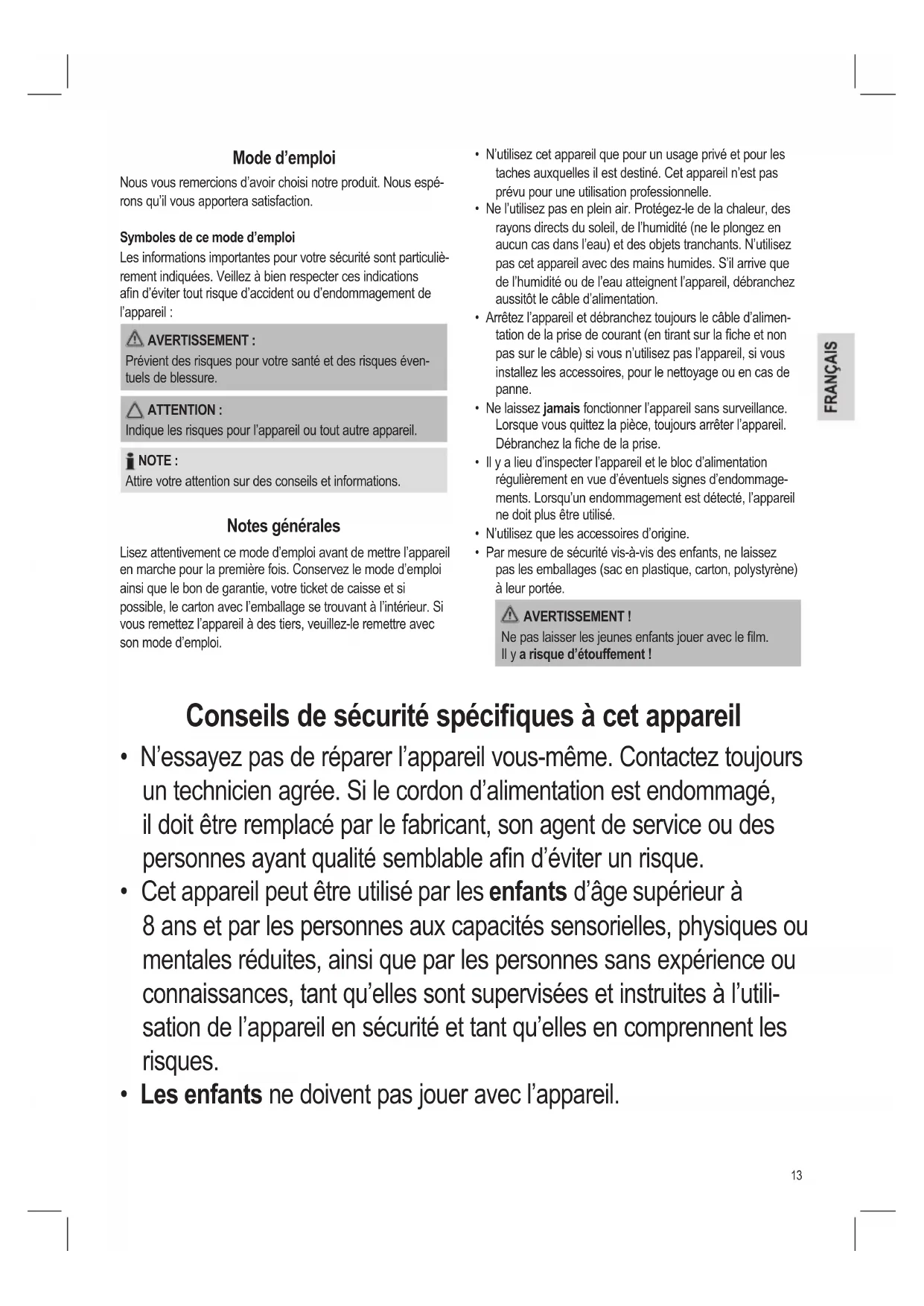 - Par mesure de sécurité vis-à-vis des enfants, ne laissez pas les emballages (sac en plastique, carton, polystyrène) à leur portée. AVERTISSEMENT ! Ne pas laisser les jeunes enfants jouer avec le lm. Il y a risque d’étouffement ! Conseils de sécurité spéciques à cet appareil