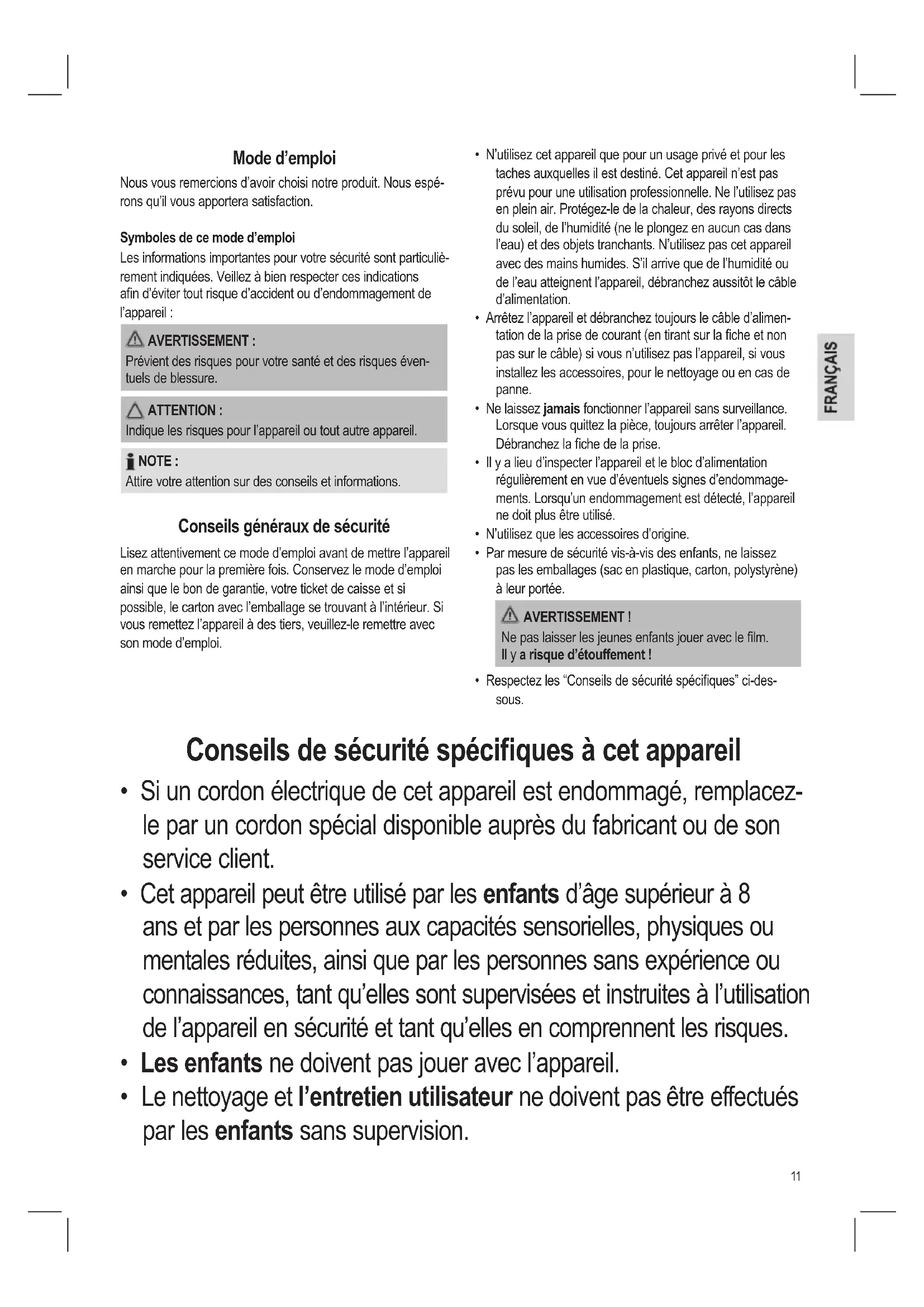 - Respectez les “Conseils de sécurité spéciques” ci-des- sous. Conseils de sécurité spéciques à cet appareil