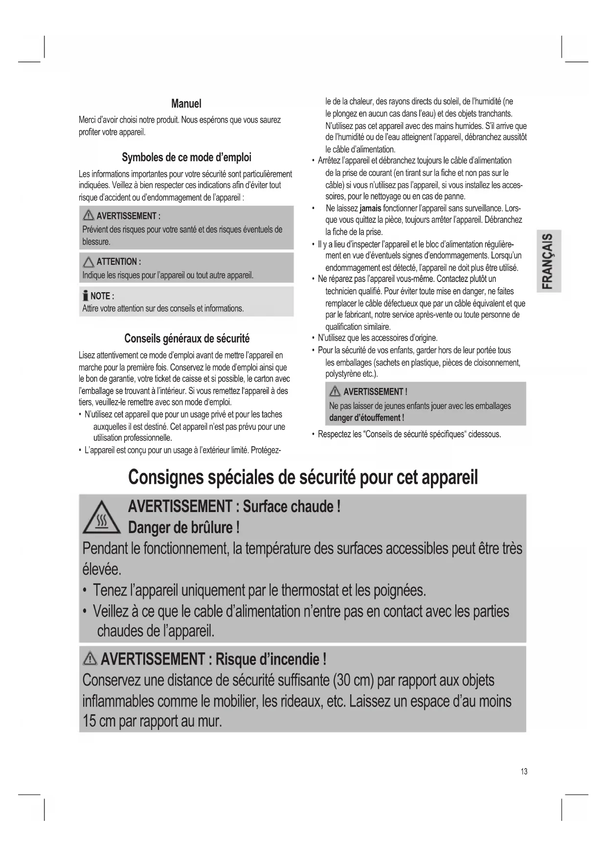 Consignes spéciales de sécurité pour cet apparéil