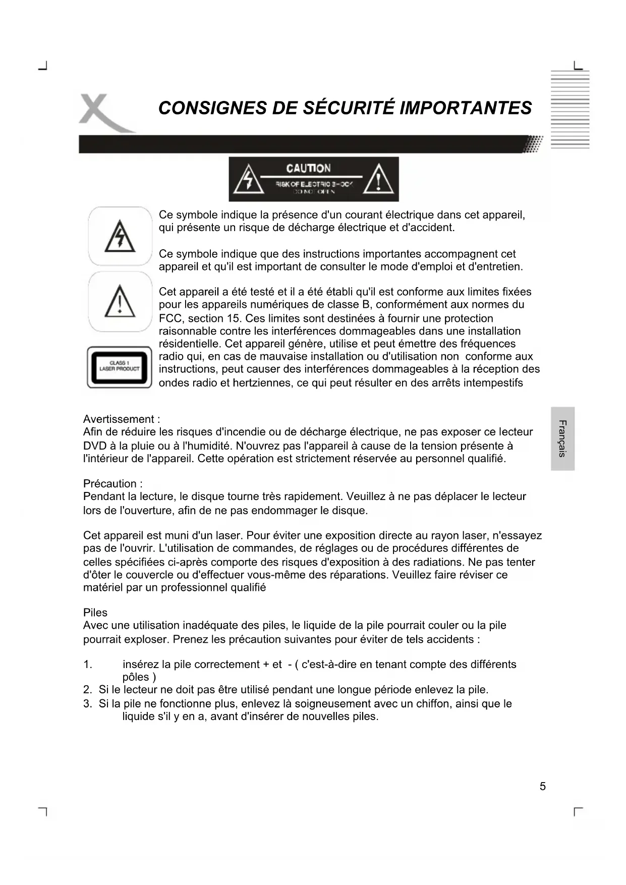 Afin de réduire les risques d'incendie ou de décharge électrique, ne pas exposer ce lecteur DVD à la pluie ou à l'humidité. N'ouvrez pas l'appareil à cause de la tension présente à l'intérieur de l'appareil. Cette opération est strictement réservée au personnel qualifié. Précaution : Pendant la lecture, le disque tourne très rapidement. Veuillez à ne pas déplacer le lecteur lors de l'ouverture, afin de ne pas endommager le disque. Cet appareil est muni d'un laser. Pour éviter une exposition directe au rayon laser, n'essayez pas de l'ouvrir. L'utilisation de commandes, de réglages ou de procédures différentes de celles spécifiées ci-après comporte des risques d'exposition à des radiations. Ne pas tenter d'ôter le couvercle ou d'effectuer vous-même des réparations. Veuillez faire réviser ce matériel par un professionnel qualifié Piles Avec une utilisation inadéquate des piles, le liquide de la pile pourrait couler ou la pile pourrait exploser. Prenez les précaution suivantes pour éviter de tels accidents :
