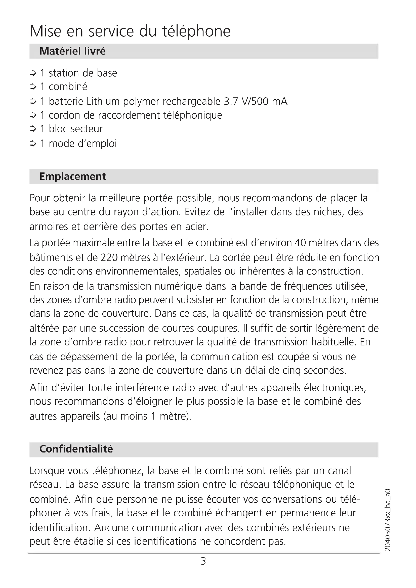 20405073xx_ba_a02 20405073xx_ba_a0 Répertoire………………………………………………………………………13 Créer/éditer une entrée dans le répertoire ………………………………13 Numéroter à l’aide du répertoire …………………………………………13 Effacer des entrées du répertoire/le répertoire en entier ………………14 Afficher une entrée…………………………………………………………14 Afficher la capacité restante ………………………………………………14 Numérotation confortable …………………………………………………15 Liste de répétition …………………………………………………………15 Liste d’appels*………………………………………………………………16 Touches d’accès direct ……………………………………………………17 Réglages ………………………………………………………………………18 Audio ………………………………………………………………………18 Écran…………………………………………………………………………18 Régler l’heure et la date……………………………………………………19 Mise à zéro …………………………………………………………………19 Réglages du combiné…………………………………………………………20 Appel direct (baby call) ……………………………………………………20 Réponse automatique/Raccrocher automatique …………………………21 ECO Mode …………………………………………………………………21 Régler la langue ……………………………………………………………21 Réglages de la station de base ……………………………………………22 Modifier le code PIN ………………………………………………………22 Régler la mélodie/le volume de sonnerie de la base ……………………22 Mode de numérotation ……………………………………………………23 Sélectionner le temps de flash ……………………………………………23 Combinés supplémentaires …………………………………………………24 Déclarer des combinés supplémentaires …………………………………24 Supprimer un combiné ……………………………………………………24 Informations importantes …………………………………………………25 Homologation et conformité ………………………………………………25 Garantie ……………………………………………………………………25 Bon de garantie ………………………………………………………………79 Sommaire3 20405073xx_ba_a0 Matériel livré ➭ 1 station de base ➭ 1 combiné ➭ 1 batterie Lithium polymer rechargeable 3.7 V/500 mA ➭ 1 cordon de raccordement téléphonique ➭ 1 bloc secteur ➭ 1 mode d’emploi Emplacement Pour obtenir la meilleure portée possible, nous recommandons de placer la base au centre du rayon d’action. Evitez de l’installer dans des niches, des armoires et derrière des portes en acier. La portée maximale entre la base et le combiné est d’environ 40 mètres dans des bâtiments et de 220 mètres à l’extérieur. La portée peut être réduite en fonction des conditions environnementales, spatiales ou inhérentes à la construction. En raison de la transmission numérique dans la bande de fréquences utilisée, des zones d’ombre radio peuvent subsister en fonction de la construction, même dans la zone de couverture. Dans ce cas, la qualité de transmission peut être altérée par une succession de courtes coupures. Il suffit de sortir légèrement de la zone d’ombre radio pour retrouver la qualité de transmission habituelle. En cas de dépassement de la portée, la communication est coupée si vous ne revenez pas dans la zone de couverture dans un délai de cinq secondes. Afin d’éviter toute interférence radio avec d’autres appareils électroniques, nous recommandons d’éloigner le plus possible la base et le combiné des autres appareils (au moins 1 mètre). Confidentialité Lorsque vous téléphonez, la base et le combiné sont reliés par un canal réseau. La base assure la transmission entre le réseau téléphonique et le combiné. Afin que personne ne puisse écouter vos conversations ou télé- phoner à vos frais, la base et le combiné échangent en permanence leur identification. Aucune communication avec des combinés extérieurs ne peut être établie si ces identifications ne concordent pas. Mise en service du téléphone4 20405073xx_ba_a0 Mise en service du téléphone Installer la base ➭ La base ne doit pas être exposée en plein soleil et doit être protégée de l’humidité. Elle ne doit pas être placée dans des locaux sujets à la conden- sation, à des vapeurs corrosives ou à un fort dégagement de poussière. La condensation peut survenir dans des caves, des garages, des jardins d’hiver ou des endroits confinés. ➭ La température ambiante doit se situer entre 5 °C et 40 °C. L’emplacement de la base doit être propre, sec et bien ventilé. Choisissez un emplacement stable, à niveau et non exposé à des chocs. N’installez pas la base à proximité immédiate d’appareils électroniques tels que des appareils Hi-Fi, des appareils de bureau ou à micro-ondes pour éviter toute interférence. Evitez aussi de l’installer à proximité de sources de chaleur telles que des radiateurs ou d’obstacles tels que des portes métalliques, des murs épais, dans des niches et des armoires. La base n’étant pas pourvue d’un interrupteur, la prise de courant à laquelle elle est branchée doit être aisément accessible. Raccorder le téléphone ➀ Cordon de raccordement téléphonique Introduisez le cordo