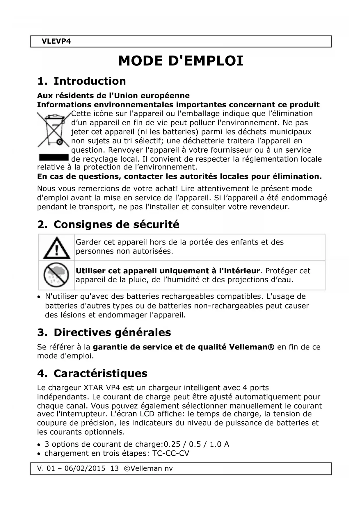 VLEVP4 - Chargeur de piles VELLEMAN - Notice d'utilisation et mode d'emploi gratuit