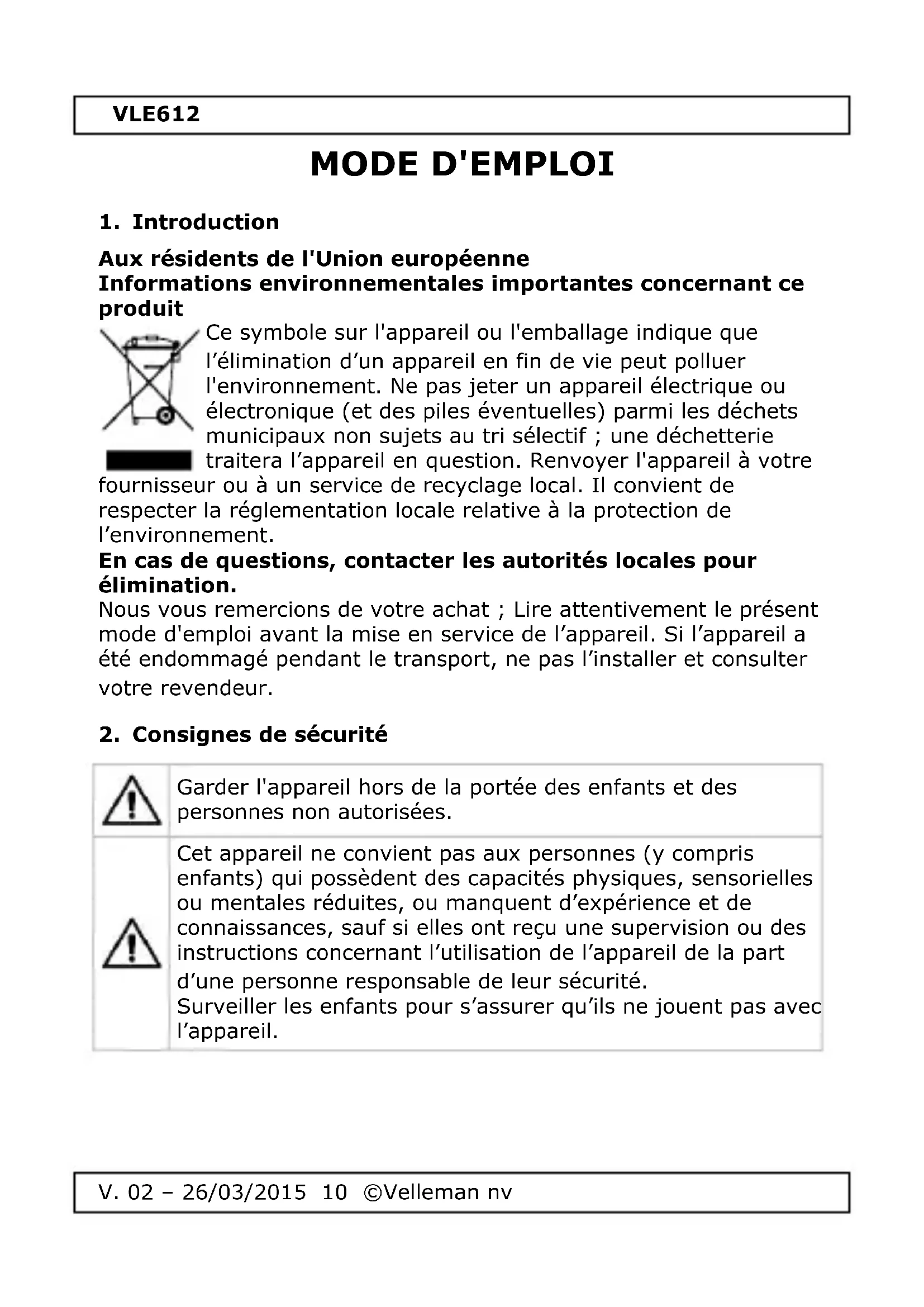 Retrouvez gratuitement la notice de l'appareil VLE612 VELLEMAN au format PDF.