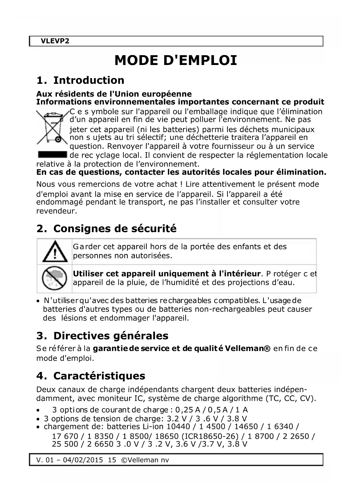 VLEVP2 - Chargeur de piles VELLEMAN - Notice d'utilisation et mode d'emploi gratuit