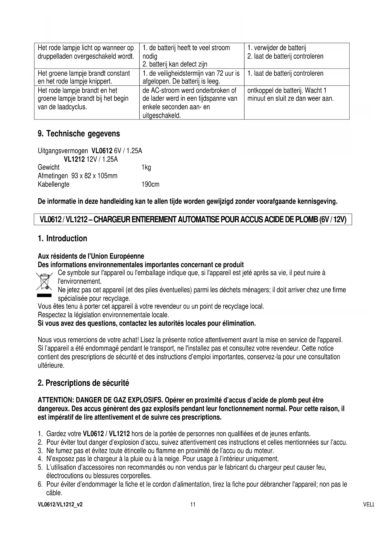 - Utilisez le chargeur UNIQUEMENT pour charger des accus d'acide de plomb rechargeables. Le VL0612 / VL1212 n'a pas ete concu pour alimenter un systeme basse tension ou pour charger des accus rechargeables autres que des accus d'acide de plomb. Charger des piles sèches rechargeables peut les faire exploser, bleser des personnes et causer des dommages.