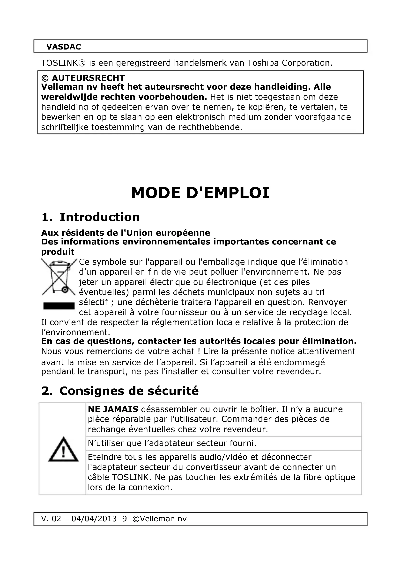 MODE D'EMPLOI VASDAC VELLEMAN