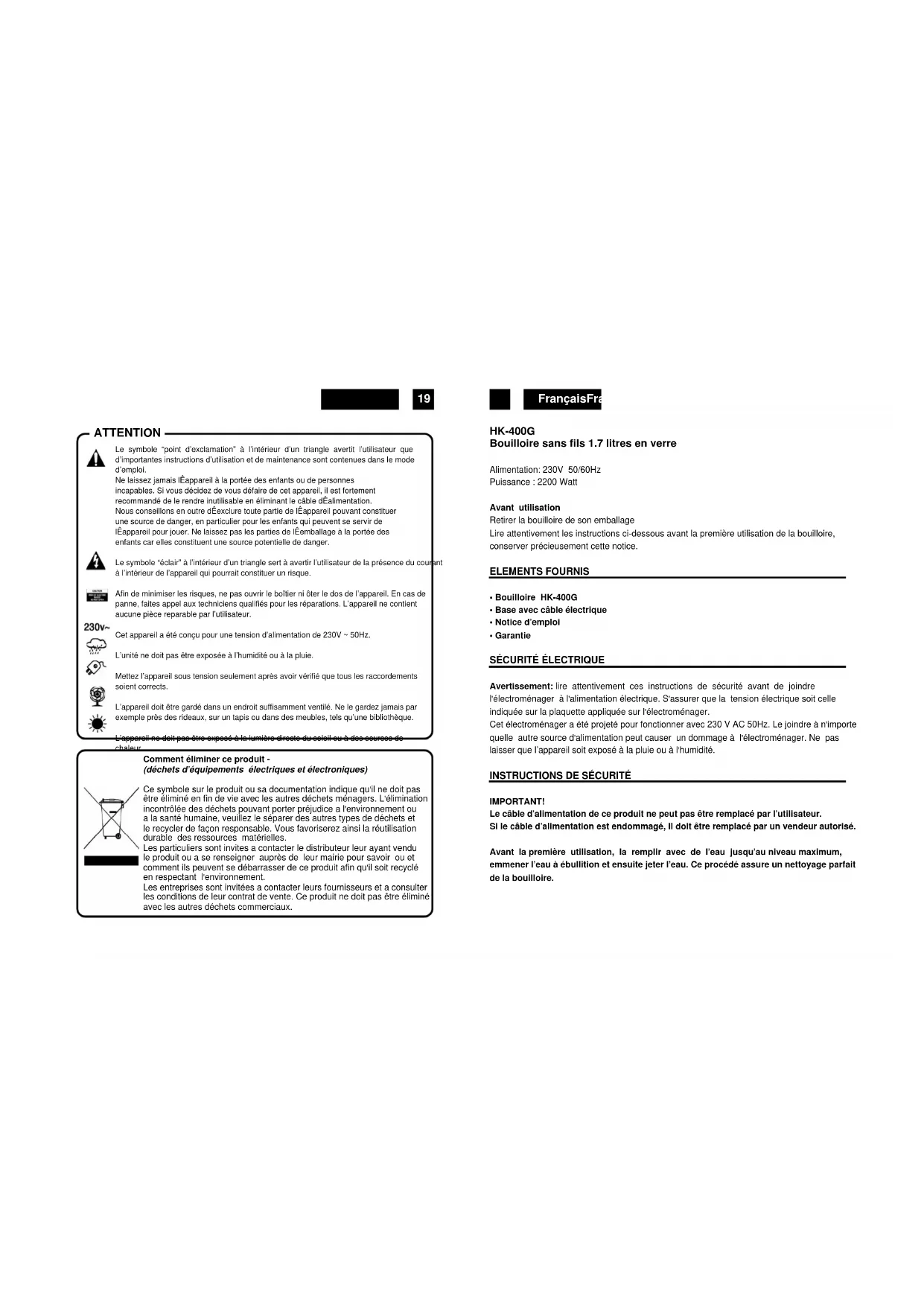 HK-400G Bouilloire sans fils 1.7 litres en verre Alimentation: 230V 50/60Hz Puissance : 2200 Watt Avant utilisation Retirer la bouilloire de son emballage Lire attentivement les instructions ci-dessous avant la première utilisation de la bouilloire, conserver précieusement cette notice. ELEMENTS FOURNIS