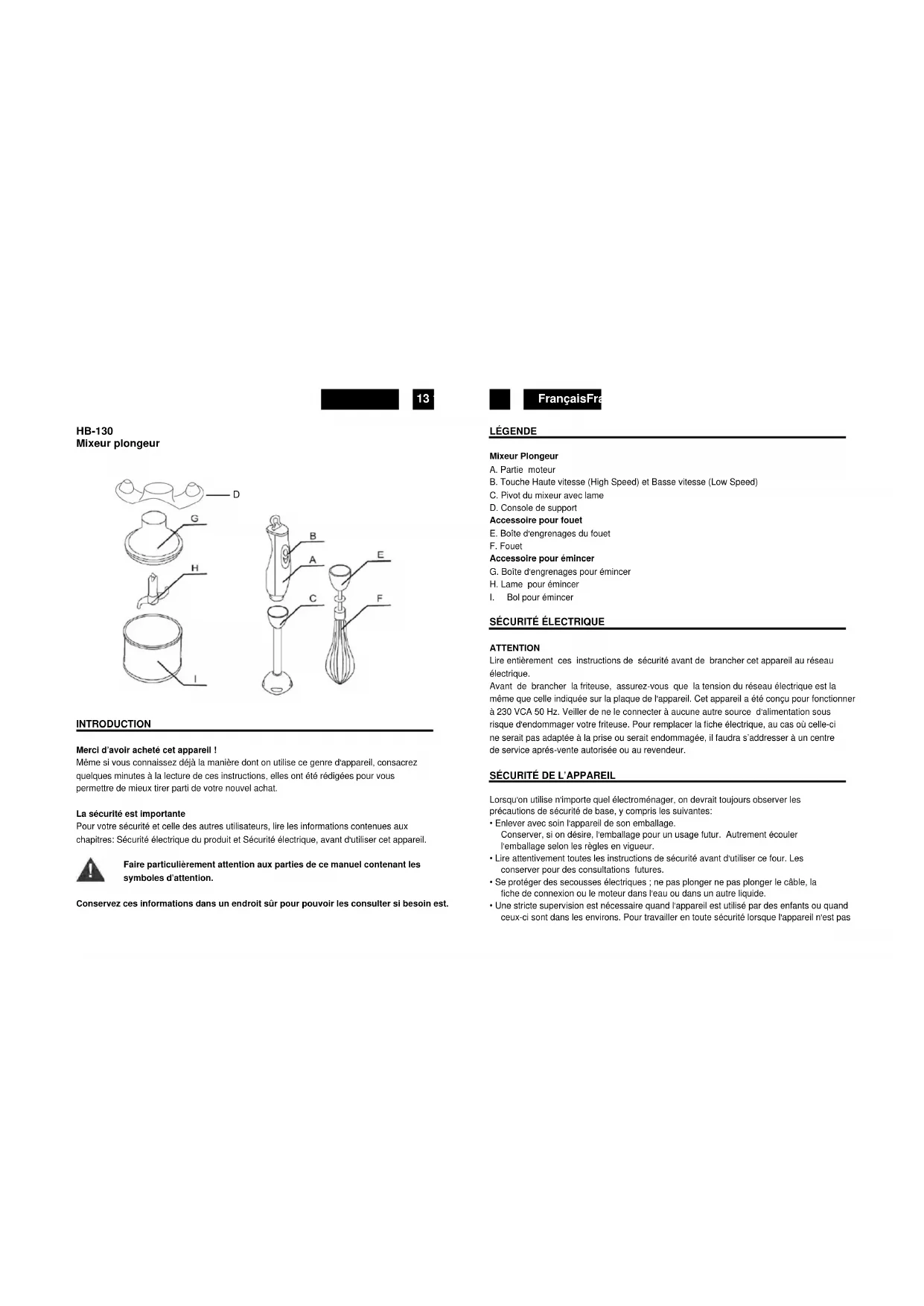 Ne Jamals allumer le mixeur a Immerson avant de I'avoir positionné dans le bol à mixage ou dans un autre填补ant apé à l'usage. Les lames tranchantes des couteaux en acier inoxydable peuvent cause des blessures si vous les touchez.