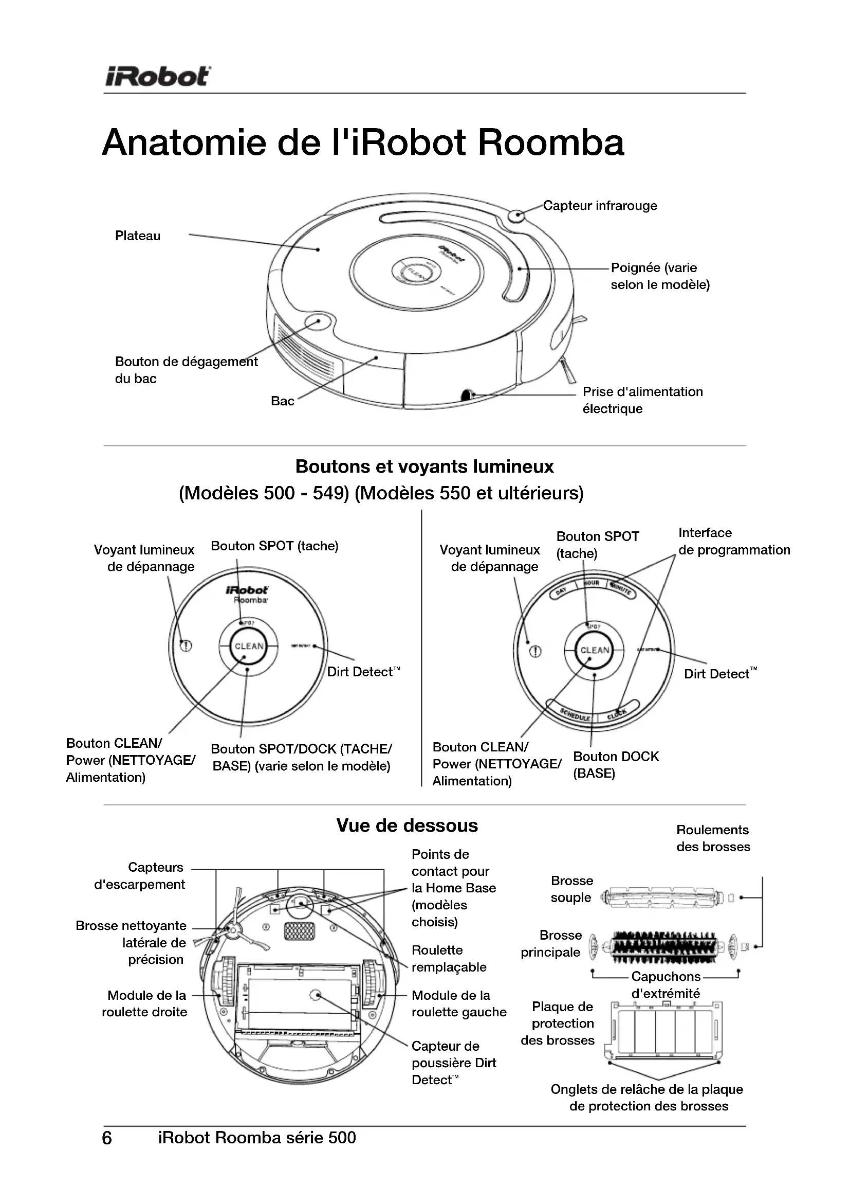 Module de la roulette gauche Module de la roulette droite Points de contact pour la Home Base (modèles choisis) Onglets de relâche de la plaque de protection des brosses Roulements des brosses Plaque de protection des brosses Roulette remplaçable Boutons et voyants lumineux Vue de dessous (Modèles 500 - 549) (Modèles 550 et ultérieurs) Interface de programmation Brosse principale Voyant lumineux de dépannage Plateau Bac Bouton DOCK (BASE) Bouton SPOT (tache) Bouton CLEAN/ Power (NETTOYAGE/ Alimentation) Dirt Detect