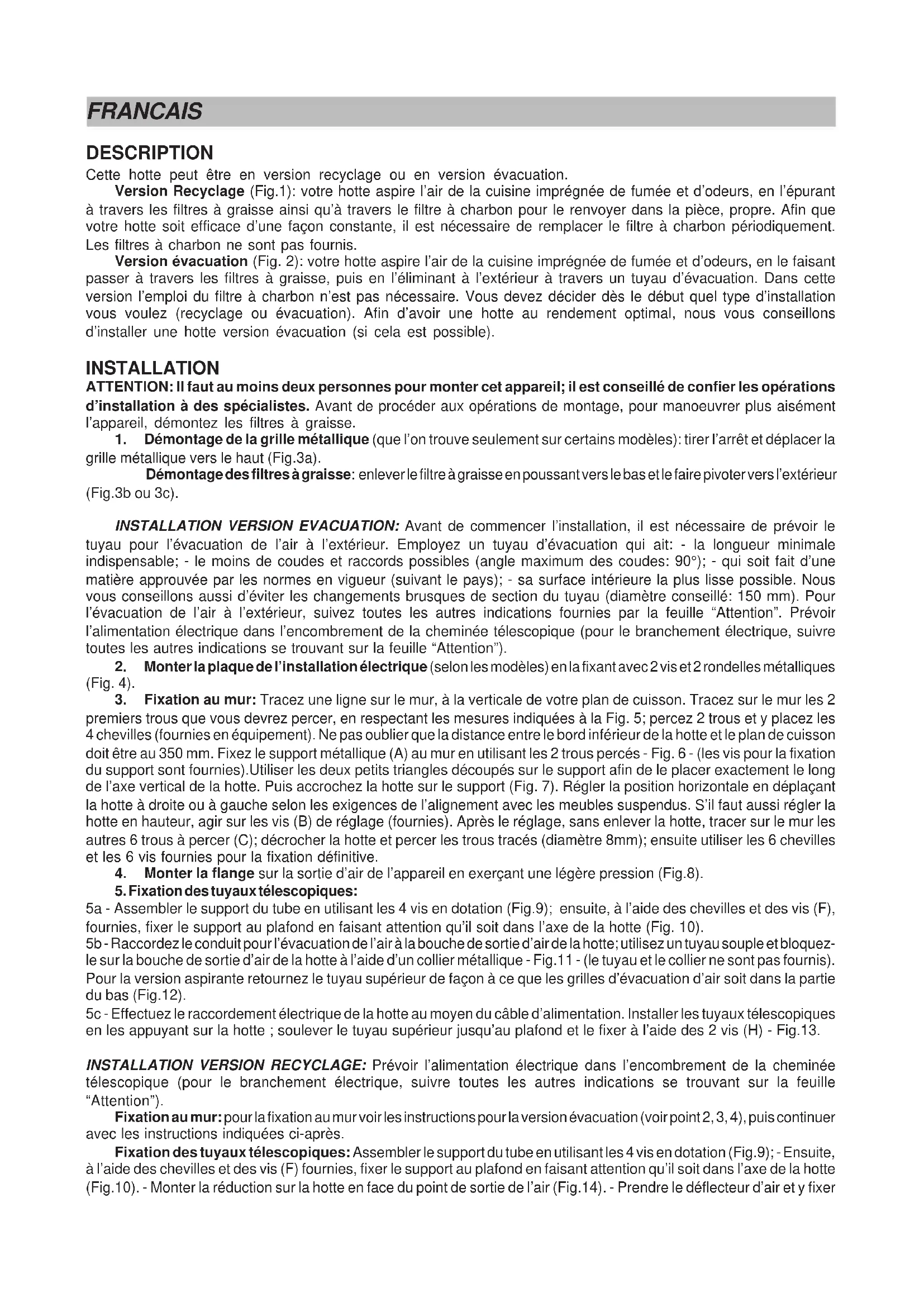 grille métallique vers le haut (Fig.3a). Démontage des filtres à graisse: enlever le filtre à graisse en poussant vers le bas et le faire pivoter vers l’extérieur (Fig.3b ou 3c). INSTALLATION VERSION EVACUATION: Avant de commencer l’installation, il est nécessaire de prévoir le tuyau pour l’évacuation de l’air à l’extérieur. Employez un tuyau d’évacuation qui ait: - la longueur minimale indispensable; - le moins de coudes et raccords possibles (angle maximum des coudes: 90°); - qui soit fait d’une matière approuvée par les normes en vigueur (suivant le pays); - sa surface intérieure la plus lisse possible. Nous vous conseillons aussi d’éviter les changements brusques de section du tuyau (diamètre conseillé: 150 mm). Pour l’évacuation de l’air à l’extérieur, suivez toutes les autres indications fournies par la feuille “Attention”. Prévoir l’alimentation électrique dans l’encombrement de la cheminée télescopique (pour le branchement électrique, suivre toutes les autres indications se trouvant sur la feuille “Attention”).