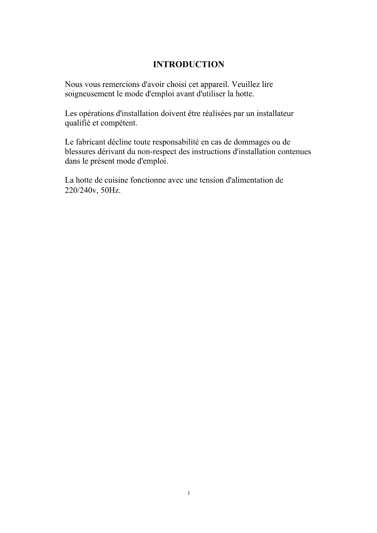 Empêchez les enfants d'utiliser la hotte de cuisine. Cet appareil est conçu exclusivement pour un usage domestique. Il ne peut être utilisé pour les cuissons au barbecue, dans les rôtisseries ou pour tout autre usage commercial. Les opérations d'installation doivent être réalisées uniquement par un électricien qualifié ou toute autre personne compétente. Nettoyez régulièrement la hotte et le filtre, afin de garantir le bon f onctionnement de l'appareil. Avant de procéder au nettoyage de la hotte, veillez toujours à la débrancher de l'alimentation secteur. Procédez au nettoyage de la hotte en suivant les instructions fournies dans la présente notice. Évitez que la hotte ne prenne feu. Ne séchez pas la hotte à l’aide de flammes nues. En cas de problème de fonctionnement, contactez le Service Après-vente. Veillez à ce que la pièce dans laquelle sont installées la hotte et la cuisinière à gaz soit suffisamment ventilée. Les fumées doivent être évacuées à travers un conduit séparé du conduit utilisé pour la cuisinière à gaz ou tout autre appareil de cuisine. Avant de procéder à l'installation et d'utiliser l'appareil, vérifiez que la tension (V) et la fréquence (Hz) indiquées sur la plaque signalétique de l'appareil correspondent à celles de votre installation domestique. Afin de tirer le meilleur parti de votre appareil, nous vous invitons à l ire soigneusement la présente notice et à la conserver en lieu sûr toute consultation future. Vérifiez que vous disposez de la garantie relative à votre appareil. En cas de réparation, il vous sera demandé de produire la garantie et le ticket de caisse pour pouvoir bénéficier de celle-ci.