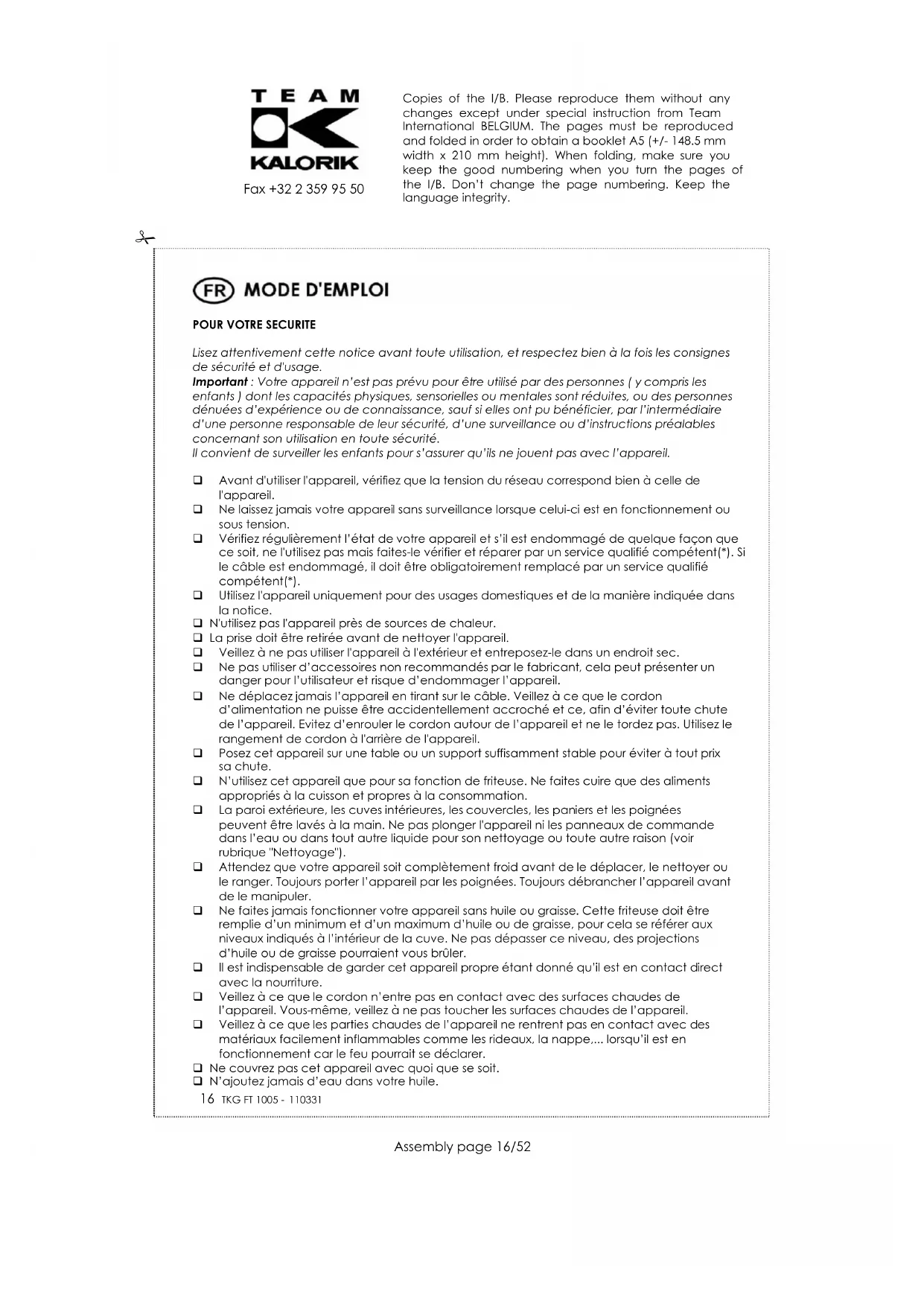 Lisez attentivement cette notice avant toute utilisation, et respectez bien à la fois les consignes de sécurité et d'usage. Important : Votre appareil n’est pas prévu pour être utilisé par des personnes ( y compris les enfants ) dont les capacités physiques, sensorielles ou mentales sont réduites, ou des personnes dénuées d’expérience ou de connaissance, sauf si elles ont pu bénéficier, par l’intermédiaire d’une personne responsable de leur sécurité, d’une surveillance ou d’instructions préalables concernant son utilisation en toute sécurité. Il convient de surveiller les enfants pour s’assurer qu’ils ne jouent pas avec l’appareil. Avant d'utiliser l'appareil, vérifiez que la tension du réseau correspond bien à celle de l'appareil. Ne laissez jamais votre appareil sans surveillance lorsque celui-ci est en fonctionnement ou sous tension. Vérifiez régulièrement l‟état de votre appareil et s‟il est endommagé de quelque façon que ce soit, ne l'utilisez pas mais faites-le vérifier et réparer par un service qualifié compétent(*). Si le câble est endommagé, il doit être obligatoirement remplacé par un service qualifié compétent(*). Utilisez l'appareil uniquement pour des usages domestiques et de la manière indiquée dans la notice. N'utilisez pas l'appareil près de sources de chaleur. La prise doit être retirée avant de nettoyer l'appareil. Veillez à ne pas utiliser l'appareil à l'extérieur et entreposez-le dans un endroit sec. Ne pas utiliser d‟accessoires non recommandés par le fabricant, cela peut présenter un danger pour l‟utilisateur et risque d‟endommager l‟appareil. Ne déplacez jamais l‟appareil en tirant sur le câble. Veillez à ce que le cordon d‟alimentation ne puisse être accidentellement accroché et ce, afin d‟éviter toute chute de l‟appareil. Evitez d‟enrouler le cordon autour de l‟appareil et ne le tordez pas. Utilisez le rangement de cordon à l'arrière de l'appareil. Posez cet appareil sur une table ou un support suffisamment stable pour éviter à tout prix sa chute. N‟utilisez cet appareil que pour sa fonction de friteuse. Ne faites cuire que des aliments appropriés à la cuisson et propres à la consommation. La paroi extérieure, les cuves intérieures, les couvercles, les paniers et les poignées peuvent être lavés à la main. Ne pas plonger l'appareil ni les panneaux de commande dans l‟eau ou dans tout autre liquide pour son nettoyage ou toute autre raison (voir rubrique "Nettoyage"). Attendez que votre appareil soit complètement froid avant de le déplacer, le nettoyer ou le ranger. Toujours porter l‟appareil par les poignées. Toujours débrancher l‟appareil avant de le manipuler. Ne faites jamais fonctionner votre appareil sans huile ou graisse. Cette friteuse doit être remplie d‟un minimum et d‟un maximum d‟huile ou de graisse, pour cela se référer aux niveaux indiqués à l‟intérieur de la cuve. Ne pas dépasser ce niveau, des projections d‟huile ou de graisse pourraient vous brûler. Il est indispensable de garder cet appareil propre étant donné qu‟il est en contact direct avec la nourriture. Veillez à ce que le cordon n‟entre pas en contact avec des surfaces chaudes de l‟appareil. Vous-même, veillez à ne pas toucher les surfaces chaudes de l‟appareil. Veillez à ce que les parties chaudes de l‟appareil ne rentrent pas en contact avec des matériaux facilement inflammables comme les rideaux, la nappe,... lorsqu‟il est en fonctionnement car le feu pourrait se déclarer. Ne couvrez pas cet appareil avec quoi que se soit. N‟ajoutez jamais d‟eau dans votre huile. Copies of the I/B. Please reproduce them without any changes except under special instruction from Team International BELGIUM. The pages must be reproduced and folded in order to obtain a booklet A5 (+/- 148.5 mm width x 210 mm height). When folding, make sure you keep the good numbering when you turn the pages of the I/B. Don‟t change the page numbering. Keep the language integrity.