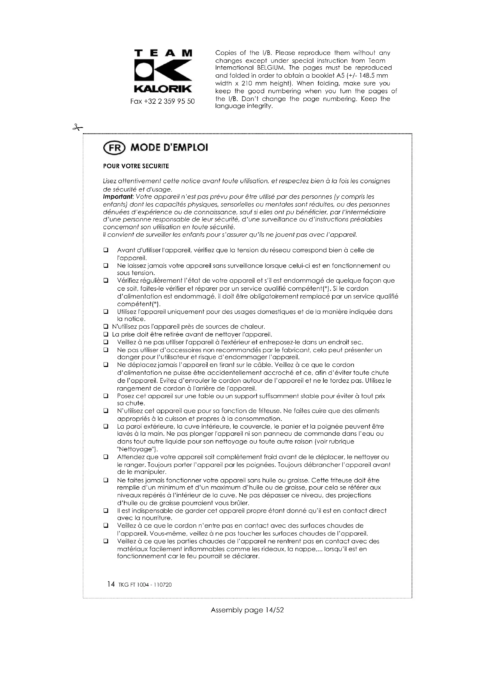 Séchez vos aliments avant de les mettre dans la friteuse. Des aliments trop humides peuvent faire bouillonner l‟huile et éventuellement la faire déborder. Veillez à ce que les aliments aient environ les mêmes dimensions pour permettre une cuisson homogène. Certains aliments peuvent être panés ou enrobés de pâte pour frire. Attendez que le préchauffage soit terminé et que le témoin s‟éteigne avant de mettre les aliments dans le panier. Ne remplissez pas trop le panier. ATTENTION: Votre friteuse est munie d'un système de sécurité qui arrête l'appareil s'il surchauffe accidentellement (par exemple en cas de dysfonctionnement du thermostat). Si ceci devait arriver, éteignez tout d‟abord l‟appareil puis débranchez la prise de courant. Copies of the I/B. Please reproduce them without any changes except under special instruction from Team International BELGIUM. The pages must be reproduced and folded in order to obtain a booklet A5 (+/- 148.5 mm width x 210 mm height). When folding, make sure you keep the good numbering when you turn the pages of the I/B. Don‟t change the page numbering. Keep the language integrity.