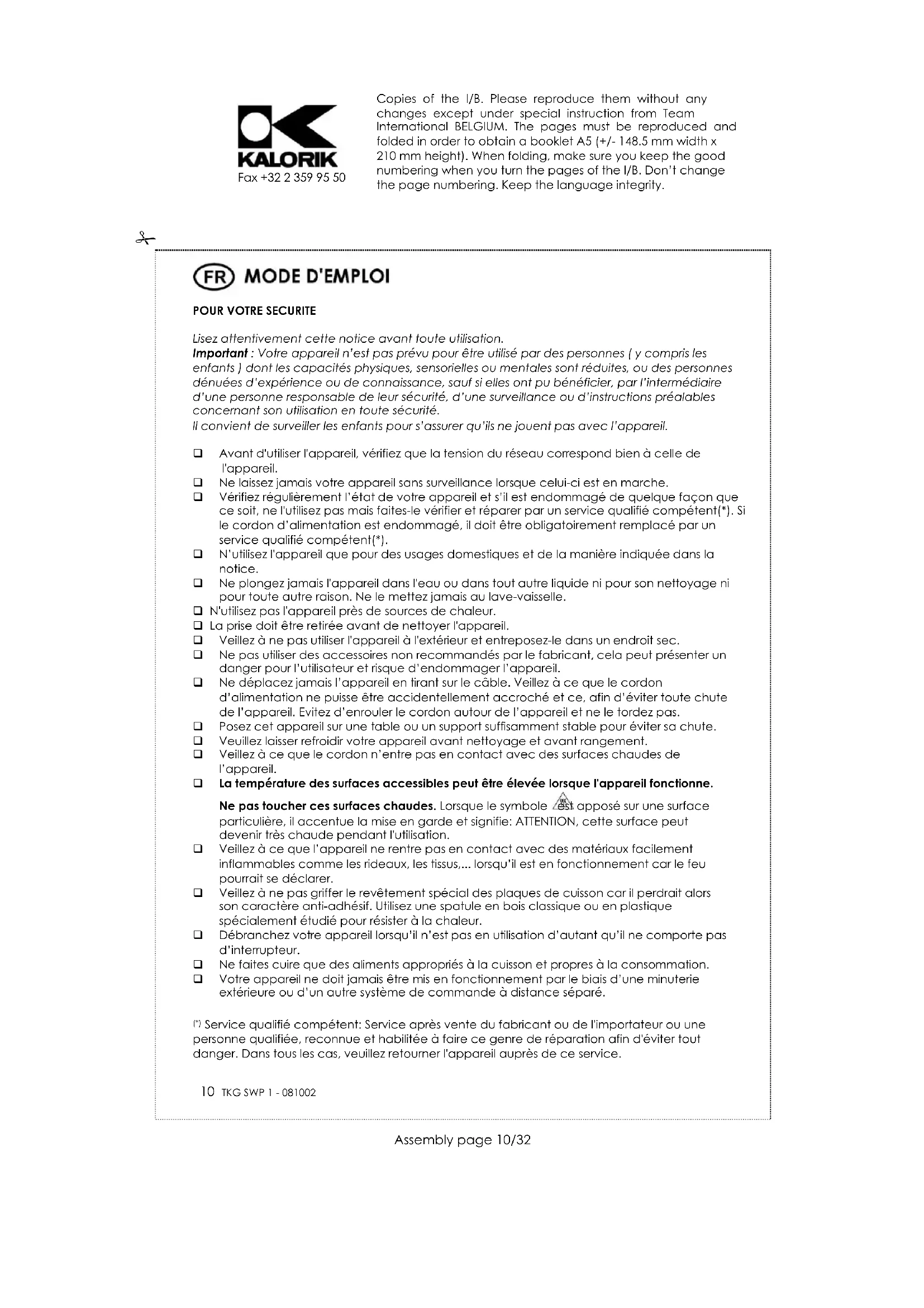 Service qualifié compétent: Service après vente du fabricant ou de l'importateur ou une personne qualifiée, reconnue et habilitée à faire ce genre de réparation afin d'éviter tout danger. Dans tous les cas, veuillez retourner l'appareil auprès de ce service. Copies of the I/B. Please reproduce them without any changes except under special instruction from Team International BELGIUM. The pages must be reproduced and folded in order to obtain a booklet A5 (+/- 148.5 mm width x 210 mm height). When folding, make sure you keep the good numbering when you turn the pages of the I/B. Don’t change the page numbering. Keep the language integrity.