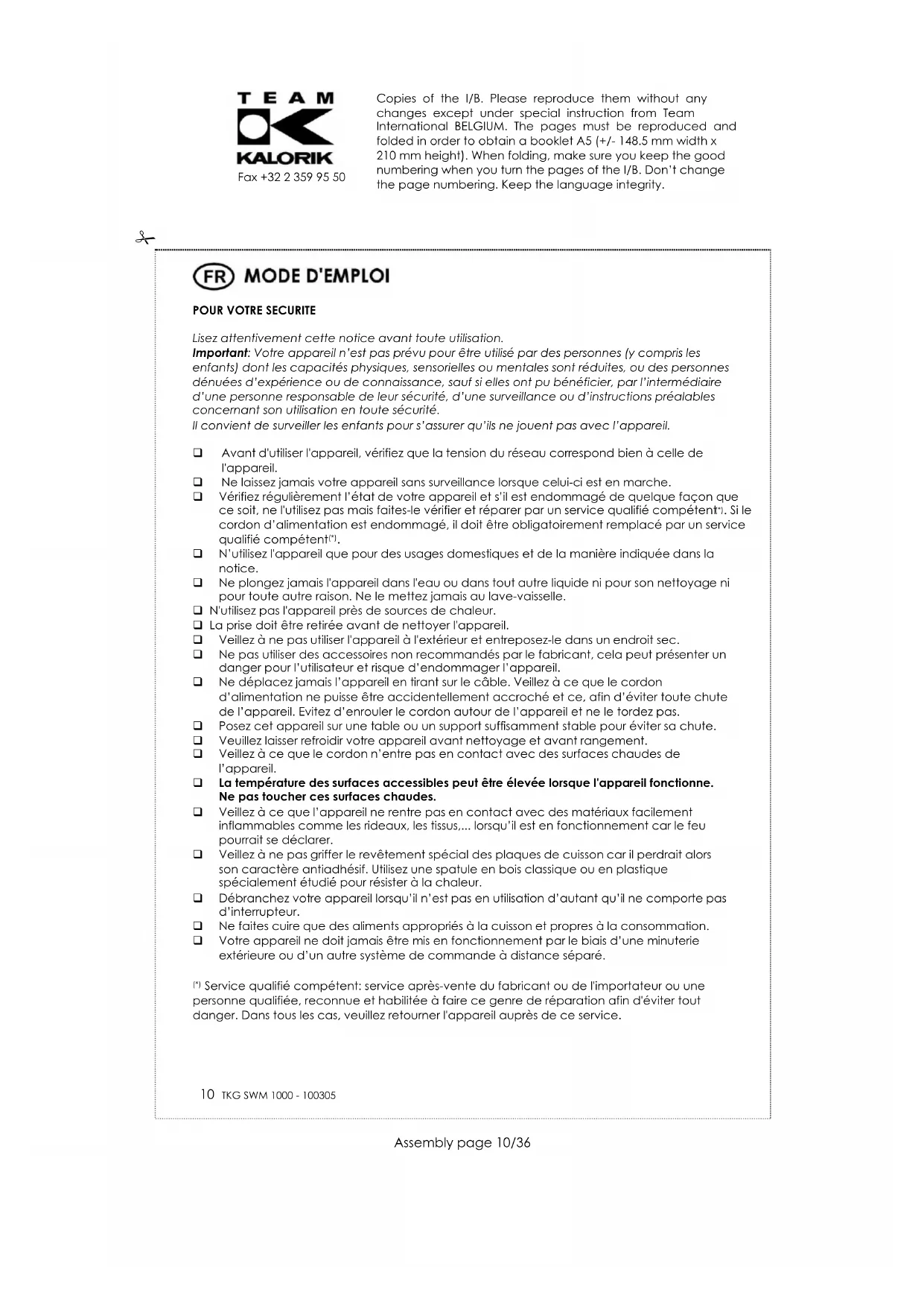 Afin de préserver notre environnement et notre santé, l’élimination en fin de vie des appareils électriques et électroniques doit se faire selon des règles bien précises et nécessite l’implication de chacun, qu’il soit fournisseur ou utilisateur. C’est pour cette raison que votre appareil, tel que le signale le symbole apposé sur sa plaque signalétique ou sur l'emballage, ne doit en aucun cas être jeté dans une poubelle publique ou privée destinée aux ordures ménagères. L'utilisateur a le droit de déposer l'appareil dans des lieux publics de collecte procédant à un tri sélectif des déchets pour être soit recyclé, soit réutilisé pour d’autres applications conformément à la directive. Copies of the I/B. Please reproduce them without any changes except under special instruction from Team International BELGIUM. The pages must be reproduced and folded in order to obtain a booklet A5 (+/- 148.5 mm width x 210 mm height). When folding, make sure you keep the good numbering when you turn the pages of the I/B. Don’t change the page numbering. Keep the language integrity.