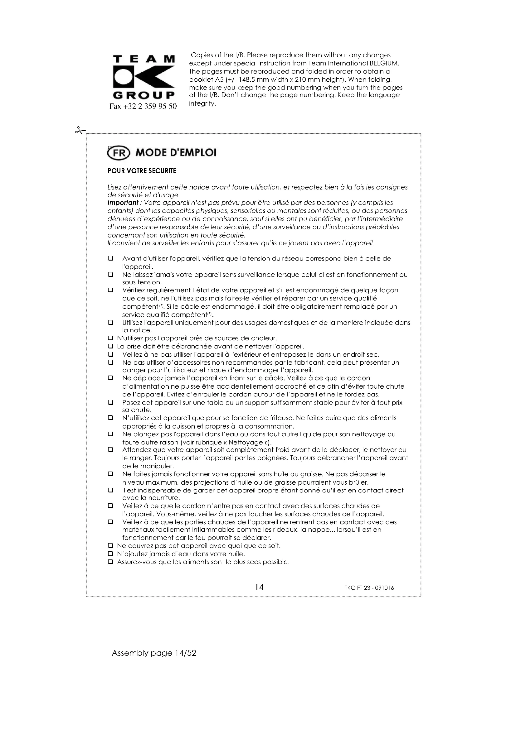 Utilisez l'appareil uniquement pour des usages domestiques et de la manière indiquée dans la notice. N'utilisez pas l'appareil près de sources de chaleur. La prise doit être débranchée avant de nettoyer l'appareil. Veillez à ne pas utiliser l'appareil à l'extérieur et entreposez-le dans un endroit sec. Ne pas utiliser d‟accessoires non recommandés par le fabricant, cela peut présenter un danger pour l‟utilisateur et risque d‟endommager l‟appareil. Ne déplacez jamais l‟appareil en tirant sur le câble. Veillez à ce que le cordon d‟alimentation ne puisse être accidentellement accroché et ce afin d‟éviter toute chute de l‟appareil. Evitez d‟enrouler le cordon autour de l‟appareil et ne le tordez pas. Posez cet appareil sur une table ou un support suffisamment stable pour éviter à tout prix sa chute. N‟utilisez cet appareil que pour sa fonction de friteuse. Ne faites cuire que des aliments appropriés à la cuisson et propres à la consommation. Ne plongez pas l'appareil dans l‟eau ou dans tout autre liquide pour son nettoyage ou toute autre raison (voir rubrique « Nettoyage »). Attendez que votre appareil soit complètement froid avant de le déplacer, le nettoyer ou le ranger. Toujours porter l‟appareil par les poignées. Toujours débrancher l‟appareil avant de le manipuler. Ne faites jamais fonctionner votre appareil sans huile ou graisse. Ne pas dépasser le niveau maximum, des projections d‟huile ou de graisse pourraient vous brûler. Il est indispensable de garder cet appareil propre étant donné qu‟il est en contact direct avec la nourriture. Veillez à ce que le cordon n‟entre pas en contact avec des surfaces chaudes de l‟appareil. Vous-même, veillez à ne pas toucher les surfaces chaudes de l‟appareil. Veillez à ce que les parties chaudes de l‟appareil ne rentrent pas en contact avec des matériaux facilement inflammables comme les rideaux, la nappe... lorsqu‟il est en fonctionnement car le feu pourrait se déclarer. Ne couvrez pas cet appareil avec quoi que ce soit. N‟ajoutez jamais d‟eau dans votre huile. Assurez-vous que les aliments sont le plus secs possible.Copies of the I/B. Please reproduce them without any changes except under special instruction from Team International BELGIUM. The pages must be reproduced and folded in order to obtain a booklet A5 (+/- 148.5 mm width x 210 mm height). When folding, make sure you keep the good numbering when you turn the pages of the I/B. Don‟t change the page numbering. Keep the language integrity.