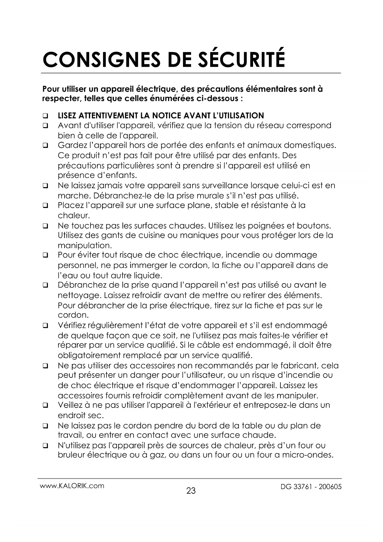www.KALORIK.com DG 33761 - 200605 ❑ Soyez prudent si vous transportez l’appareil lorsqu’il contient des aliments chauds, de l’eau ou d’autres liquides. Il est fortement déconseillé de transporter votre appareil lorsqu’il n’est pas totalement froid.