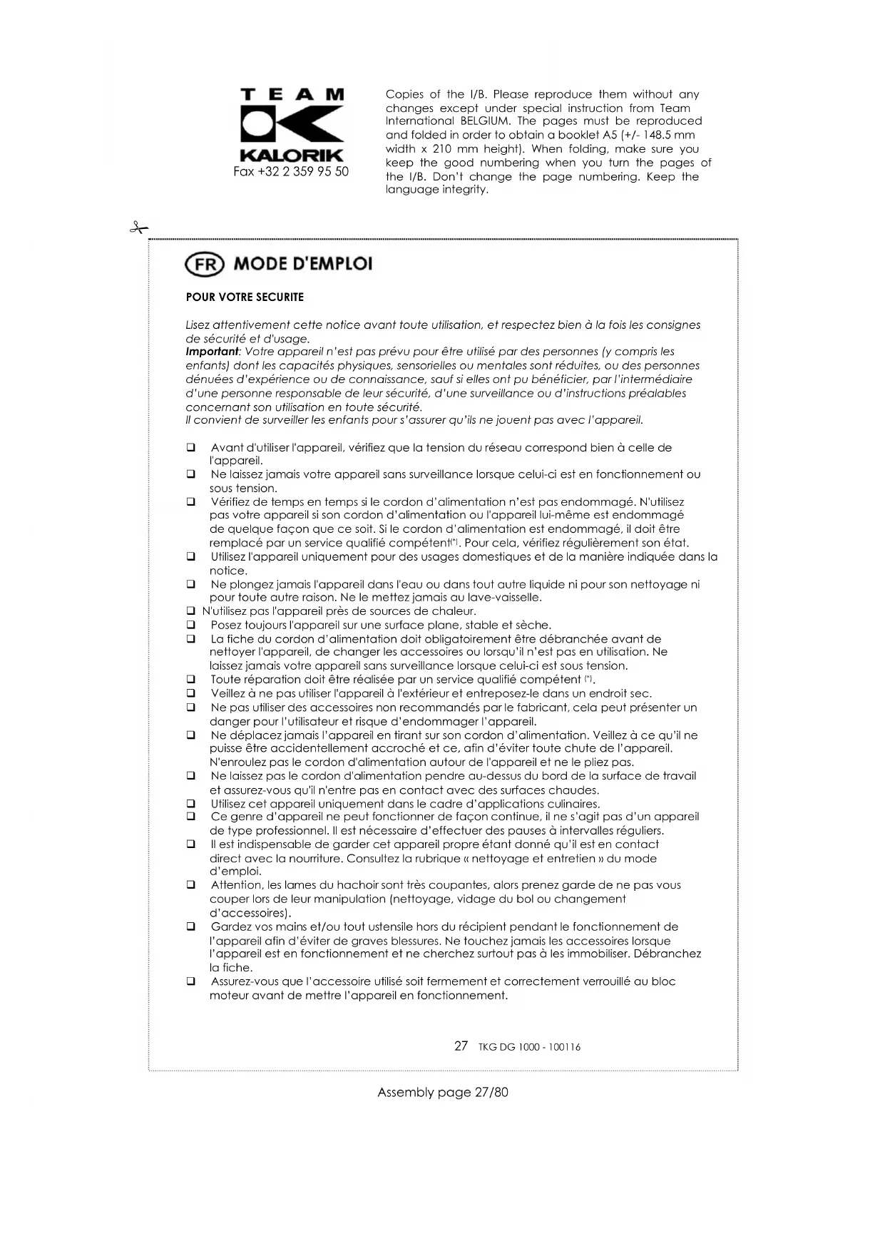 LORS DE LA PREPARATION D'ALIMENTS QUI CONTIENNENT DES COLORANTS (par exemple des carottes) IL SE PEUT QUE CERTAINES PARTIES DE L'APPAREIL CHANGENT DE COULEUR. Aucune des parties de l’appareil (bloc moteur, bol mélangeurs, accessoires) n’est susceptible d’être mise et nettoyée au lave-vaisselle. Nettoyage du corps de l’appareil Débranchez toujours l'appareil et laissez-le refroidir avant de le nettoyer. N'immergez pas l'appareil dans l'eau ou tout autre liquide. Essuyez l’extérieur de l’appareil uniquement à l’aide d’un chiffon légèrement humide. Ne nettoyez jamais votre appareil à l’aide de produits abrasifs ou détergents car cela abîmerait le revêtement. Avertissement! Débranchez toujours l'appareil et laissez-le refroidir avant de le nettoyer. Nettoyage de l’unité des lames Enlevez l’unité des lames du bol. Rincez-la soigneusement et enlevez tout résidu alimentaire. Nettoyez-la à l’eau savonneuse ou avec un détergent neutre. Copies of the I/B. Please reproduce them without any changes except under special instruction from Team International BELGIUM. The pages must be reproduced and folded in order to obtain a booklet A5 (+/- 148.5 mm width x 210 mm height). When folding, make sure you keep the good numbering when you turn the pages of the I/B. Don’t change the page numbering. Keep the language integrity.