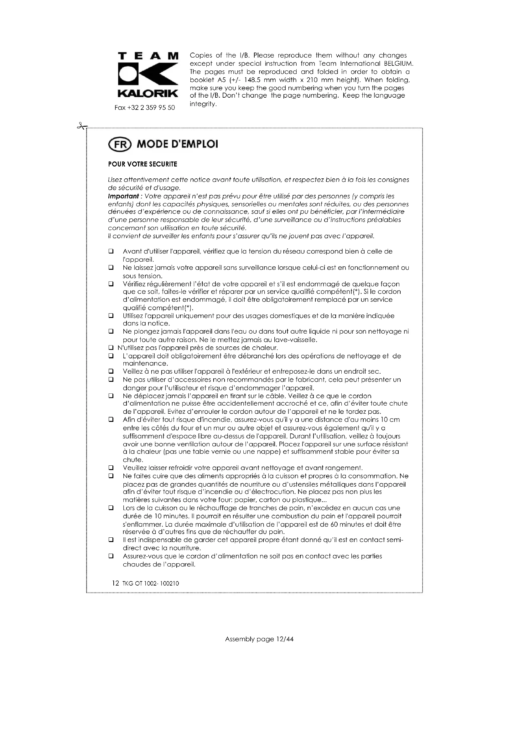 Lisez attentivement cette notice avant toute utilisation, et respectez bien à la fois les consignes de sécurité et d'usage. Important : Votre appareil n’est pas prévu pour être utilisé par des personnes (y compris les enfants) dont les capacités physiques, sensorielles ou mentales sont réduites, ou des personnes dénuées d’expérience ou de connaissance, sauf si elles ont pu bénéficier, par l’intermédiaire d’une personne responsable de leur sécurité, d’une surveillance ou d’instructions préalables concernant son utilisation en toute sécurité. Il convient de surveiller les enfants pour s’assurer qu’ils ne jouent pas avec l’appareil. Avant d'utiliser l'appareil, vérifiez que la tension du réseau correspond bien à celle de l'appareil. Ne laissez jamais votre appareil sans surveillance lorsque celui-ci est en fonctionnement ou sous tension. Vérifiez régulièrement l’état de votre appareil et s’il est endommagé de quelque façon que ce soit, faites-le vérifier et réparer par un service qualifié compétent(*). Si le cordon d’alimentation est endommagé, il doit être obligatoirement remplacé par un service qualifié compétent(*). Utilisez l'appareil uniquement pour des usages domestiques et de la manière indiquée dans la notice. Ne plongez jamais l'appareil dans l'eau ou dans tout autre liquide ni pour son nettoyage ni pour toute autre raison. Ne le mettez jamais au lave-vaisselle. N'utilisez pas l'appareil près de sources de chaleur. L’appareil doit obligatoirement être débranché lors des opérations de nettoyage et de maintenance. Veillez à ne pas utiliser l'appareil à l'extérieur et entreposez-le dans un endroit sec. Ne pas utiliser d’accessoires non recommandés par le fabricant, cela peut présenter un danger pour l’utilisateur et risque d’endommager l’appareil. Ne déplacez jamais l’appareil en tirant sur le câble. Veillez à ce que le cordon d’alimentation ne puisse être accidentellement accroché et ce, afin d’éviter toute chute de l’appareil. Evitez d’enrouler le cordon autour de l’appareil et ne le tordez pas. Afin d'éviter tout risque d'incendie, assurez-vous qu'il y a une distance d'au moins 10 cm entre les côtés du four et un mur ou autre objet et assurez-vous également qu'il y a suffisamment d'espace libre au-dessus de l'appareil. Durant l’utilisation, veillez à toujours avoir une bonne ventilation autour de l’appareil. Placez l'appareil sur une surface résistant à la chaleur (pas une table vernie ou une nappe) et suffisamment stable pour éviter sa chute. Veuillez laisser refroidir votre appareil avant nettoyage et avant rangement. Ne faites cuire que des aliments appropriés à la cuisson et propres à la consommation. Ne placez pas de grandes quantités de nourriture ou d’ustensiles métalliques dans l’appareil afin d’éviter tout risque d’incendie ou d’électrocution. Ne placez pas non plus les matières suivantes dans votre four: papier, carton ou plastique... Lors de la cuisson ou le réchauffage de tranches de pain, n’excédez en aucun cas une durée de 10 minutes. Il pourrait en résulter une combustion du pain et l'appareil pourrait s'enflammer. La durée maximale d’utilisation de l’appareil est de 60 minutes et doit être réservée à d’autres fins que de réchauffer du pain. Il est indispensable de garder cet appareil propre étant donné qu’il est en contact semi- direct avec la nourriture. Assurez-vous que le cordon d’alimentation ne soit pas en contact avec les parties chaudes de l’appareil.Copies of the I/B. Please reproduce them without any changes except under special instruction from Team International BELGIUM. The pages must be reproduced and folded in order to obtain a booklet A5 (+/- 148.5 mm width x 210 mm height). When folding, make sure you keep the good numbering when you turn the pages of the I/B. Don’t change the page numbering. Keep the language integrity.