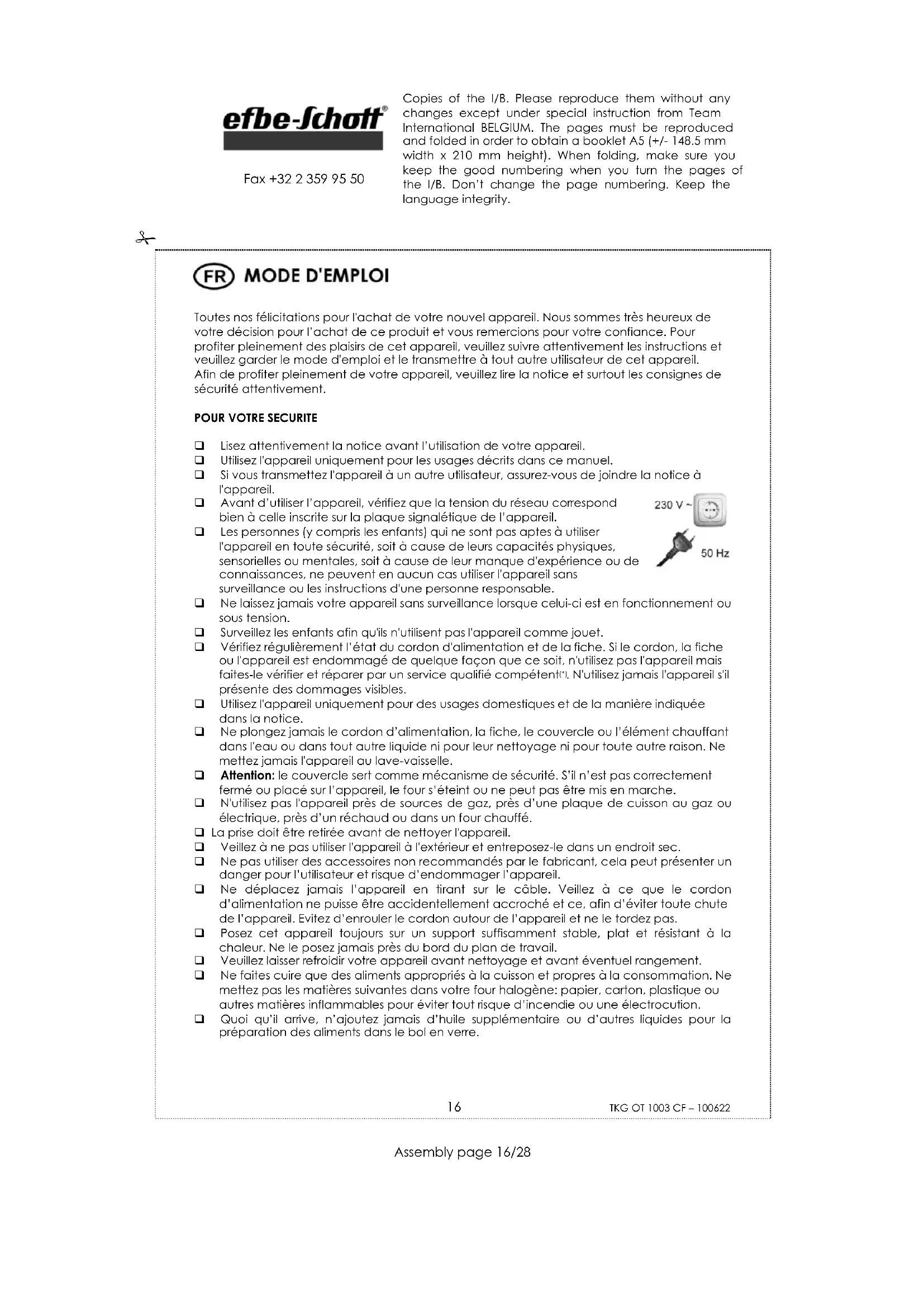 . N'utilisez jamais l'appareil s'il présente des dommages visibles. Utilisez l'appareil uniquement pour des usages domestiques et de la manière indiquée dans la notice. Ne plongez jamais le cordon d’alimentation, la fiche, le couvercle ou l’élément chauffant dans l'eau ou dans tout autre liquide ni pour leur nettoyage ni pour toute autre raison. Ne mettez jamais l'appareil au lave-vaisselle. Attention: le couvercle sert comme mécanisme de sécurité. S’il n’est pas correctement fermé ou placé sur l’appareil, le four s’éteint ou ne peut pas être mis en marche. N'utilisez pas l'appareil près de sources de gaz, près d’une plaque de cuisson au gaz ou électrique, près d’un réchaud ou dans un four chauffé. La prise doit être retirée avant de nettoyer l'appareil. Veillez à ne pas utiliser l'appareil à l'extérieur et entreposez-le dans un endroit sec. Ne pas utiliser des accessoires non recommandés par le fabricant, cela peut présenter un danger pour l’utilisateur et risque d’endommager l’appareil. Ne déplacez jamais l’appareil en tirant sur le câble. Veillez à ce que le cordon d’alimentation ne puisse être accidentellement accroché et ce, afin d’éviter toute chute de l’appareil. Evitez d’enrouler le cordon autour de l’appareil et ne le tordez pas. Posez cet appareil toujours sur un support suffisamment stable, plat et résistant à la chaleur. Ne le posez jamais près du bord du plan de travail. Veuillez laisser refroidir votre appareil avant nettoyage et avant éventuel rangement. Ne faites cuire que des aliments appropriés à la cuisson et propres à la consommation. Ne mettez pas les matières suivantes dans votre four halogène: papier, carton, plastique ou autres matières inflammables pour éviter tout risque d’incendie ou une électrocution. Quoi qu’il arrive, n’ajoutez jamais d’huile supplémentaire ou d’autres liquides pour la préparation des aliments dans le bol en verre. Copies of the I/B. Please reproduce them without any changes except under special instruction from Team International BELGIUM. The pages must be reproduced and folded in order to obtain a booklet A5 (+/- 148.5 mm width x 210 mm height). When folding, make sure you keep the good numbering when you turn the pages of the I/B. Don’t change the page numbering. Keep the language integrity.