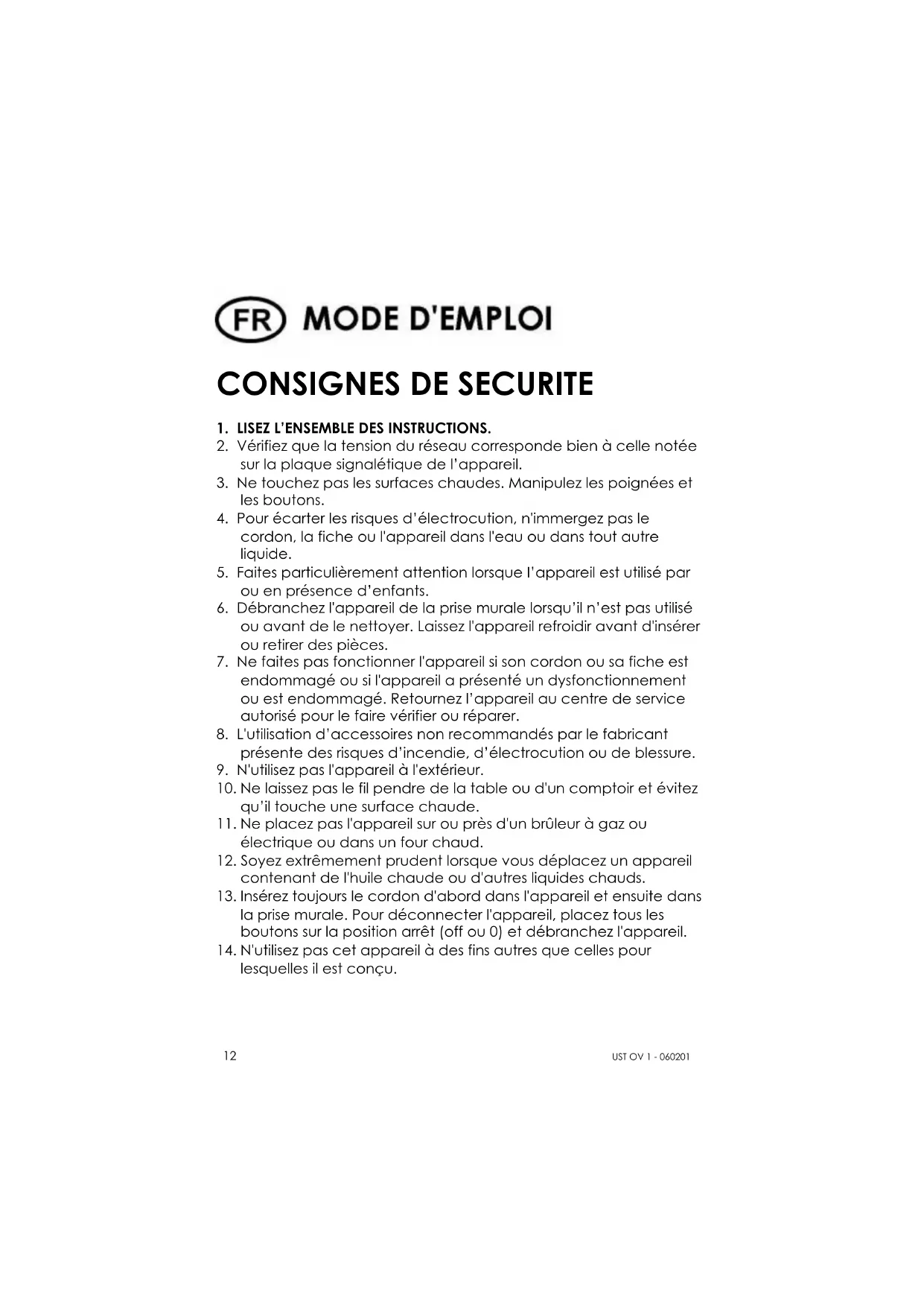 Ce produit est muni d'une fiche polarisée (une lame plus large que l'autre). Ce genre de fiche n'entre que d'une façon dans une prise polarisée, afin de minimiser les risques de chocs électriques. Si vous n'arrivez pas à enfoncer la fiche à fond dans la prise, retournez la fiche et réessayez. Si cela ne fonctionne toujours pas, faites appel à un service qualifié compétent. N'essayez jamais de modifier la fiche!14 UST OV 1 - 060201