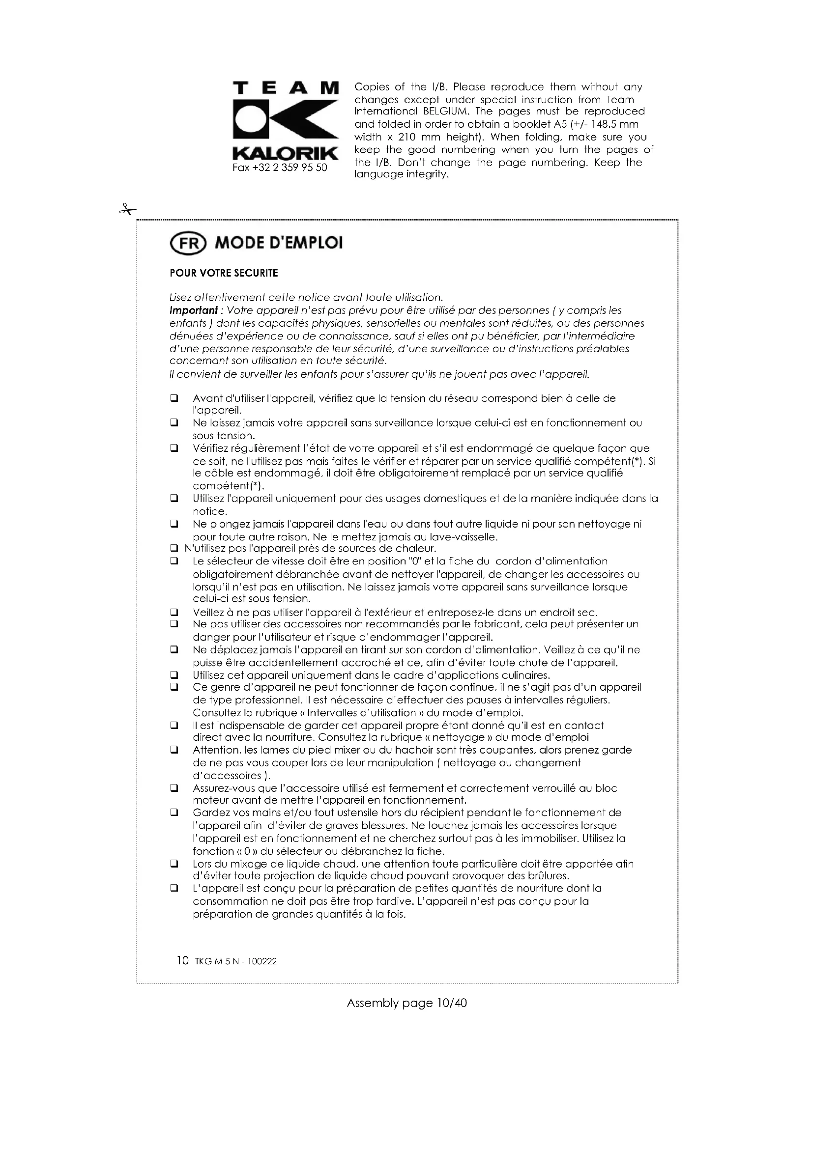 Lisez attentivement cette notice avant toute utilisation. Important : Votre appareil n’est pas prévu pour être utilisé par des personnes ( y compris les enfants ) dont les capacités physiques, sensorielles ou mentales sont réduites, ou des personnes dénuées d’expérience ou de connaissance, sauf si elles ont pu bénéficier, par l’intermédiaire d’une personne responsable de leur sécurité, d’une surveillance ou d’instructions préalables concernant son utilisation en toute sécurité. Il convient de surveiller les enfants pour s’assurer qu’ils ne jouent pas avec l’appareil. Avant d'utiliser l'appareil, vérifiez que la tension du réseau correspond bien à celle de l'appareil. Ne laissez jamais votre appareil sans surveillance lorsque celui-ci est en fonctionnement ou sous tension. Vérifiez régulièrement l’état de votre appareil et s’il est endommagé de quelque façon que ce soit, ne l'utilisez pas mais faites-le vérifier et réparer par un service qualifié compétent(*). Si le câble est endommagé, il doit être obligatoirement remplacé par un service qualifié compétent(*). Utilisez l'appareil uniquement pour des usages domestiques et de la manière indiquée dans la notice. Ne plongez jamais l'appareil dans l'eau ou dans tout autre liquide ni pour son nettoyage ni pour toute autre raison. Ne le mettez jamais au lave-vaisselle. N'utilisez pas l'appareil près de sources de chaleur. Le sélecteur de vitesse doit être en position "0" et la fiche du cordon d’alimentation obligatoirement débranchée avant de nettoyer l'appareil, de changer les accessoires ou lorsqu’il n’est pas en utilisation. Ne laissez jamais votre appareil sans surveillance lorsque celui-ci est sous tension. Veillez à ne pas utiliser l'appareil à l'extérieur et entreposez-le dans un endroit sec. Ne pas utiliser des accessoires non recommandés par le fabricant, cela peut présenter un danger pour l’utilisateur et risque d’endommager l’appareil. Ne déplacez jamais l’appareil en tirant sur son cordon d’alimentation. Veillez à ce qu’il ne puisse être accidentellement accroché et ce, afin d’éviter toute chute de l’appareil. Utilisez cet appareil uniquement dans le cadre d’applications culinaires. Ce genre d’appareil ne peut fonctionner de façon continue, il ne s’agit pas d’un appareil de type professionnel. Il est nécessaire d’effectuer des pauses à intervalles réguliers. Consultez la rubrique « Intervalles d’utilisation » du mode d’emploi. Il est indispensable de garder cet appareil propre étant donné qu’il est en contact direct avec la nourriture. Consultez la rubrique « nettoyage » du mode d’emploi Attention, les lames du pied mixer ou du hachoir sont très coupantes, alors prenez garde de ne pas vous couper lors de leur manipulation ( nettoyage ou changement d’accessoires ). Assurez-vous que l’accessoire utilisé est fermement et correctement verrouillé au bloc moteur avant de mettre l’appareil en fonctionnement. Gardez vos mains et/ou tout ustensile hors du récipient pendant le fonctionnement de l’appareil afin d’éviter de graves blessures. Ne touchez jamais les accessoires lorsque l’appareil est en fonctionnement et ne cherchez surtout pas à les immobiliser. Utilisez la fonction « 0 » du sélecteur ou débranchez la fiche. Lors du mixage de liquide chaud, une attention toute particulière doit être apportée afin d’éviter toute projection de liquide chaud pouvant provoquer des brûlures. L’appareil est conçu pour la préparation de petites quantités de nourriture dont la consommation ne doit pas être trop tardive. L’appareil n’est pas conçu pour la préparation de grandes quantités à la fois. Copies of the I/B. Please reproduce them without any changes except under special instruction from Team International BELGIUM. The pages must be reproduced and folded in order to obtain a booklet A5 (+/- 148.5 mm width x 210 mm height). When folding, make sure you keep the good numbering when you turn the pages of the I/B. Don’t change the page numbering. Keep the language integrity.