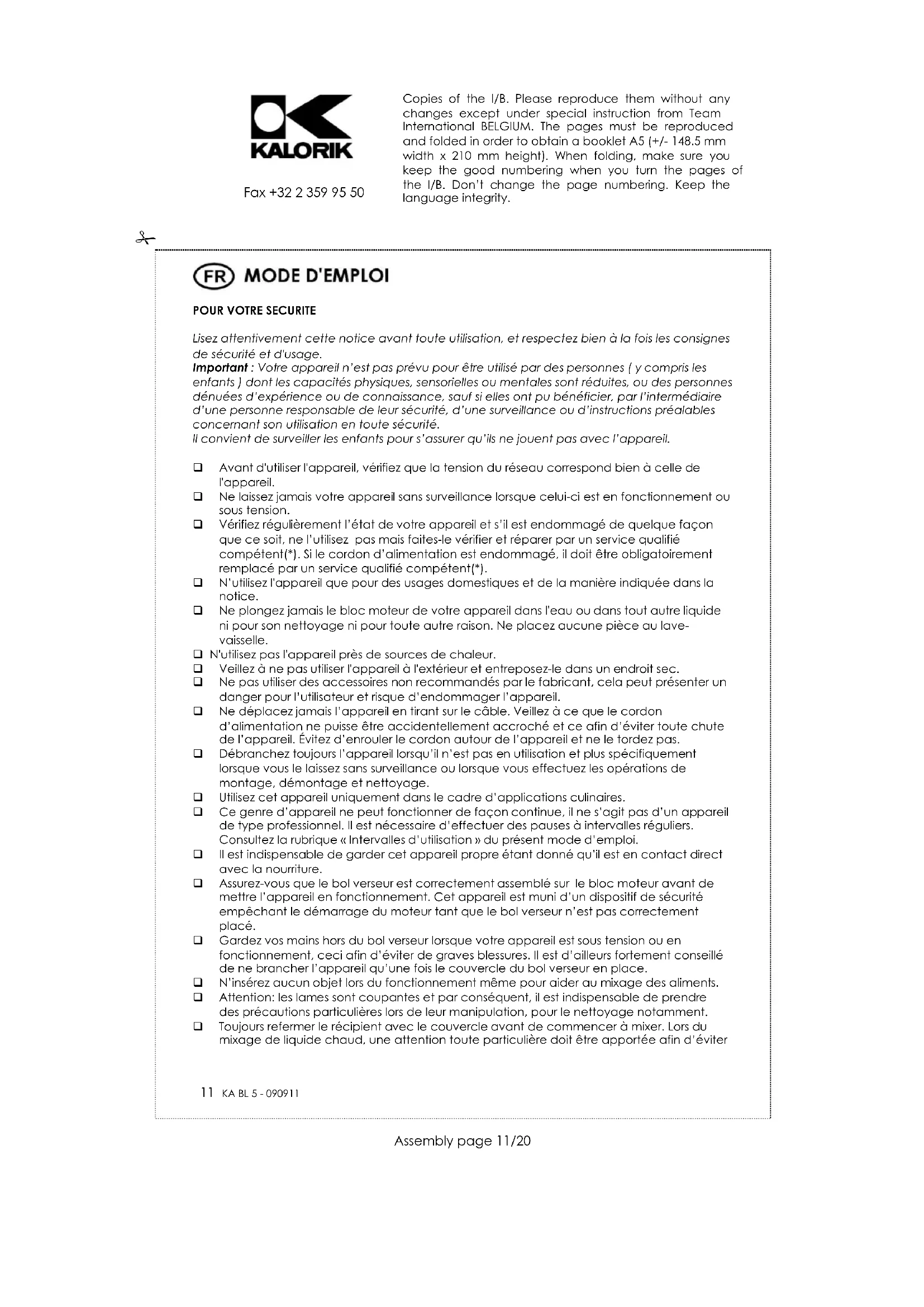 Lisez attentivement cette notice avant toute utilisation, et respectez bien à la fois les consignes de sécurité et d'usage. Important : Votre appareil n’est pas prévu pour être utilisé par des personnes ( y compris les enfants ) dont les capacités physiques, sensorielles ou mentales sont réduites, ou des personnes dénuées d’expérience ou de connaissance, sauf si elles ont pu bénéficier, par l’intermédiaire d’une personne responsable de leur sécurité, d’une surveillance ou d’instructions préalables concernant son utilisation en toute sécurité. Il convient de surveiller les enfants pour s’assurer qu’ils ne jouent pas avec l’appareil. Avant d'utiliser l'appareil, vérifiez que la tension du réseau correspond bien à celle de l'appareil. Ne laissez jamais votre appareil sans surveillance lorsque celui-ci est en fonctionnement ou sous tension. Vérifiez régulièrement l’état de votre appareil et s’il est endommagé de quelque façon que ce soit, ne l’utilisez pas mais faites-le vérifier et réparer par un service qualifié compétent(*). Si le cordon d’alimentation est endommagé, il doit être obligatoirement remplacé par un service qualifié compétent(*). N’utilisez l'appareil que pour des usages domestiques et de la manière indiquée dans la notice. Ne plongez jamais le bloc moteur de votre appareil dans l'eau ou dans tout autre liquide ni pour son nettoyage ni pour toute autre raison. Ne placez aucune pièce au lave- vaisselle. N'utilisez pas l'appareil près de sources de chaleur. Veillez à ne pas utiliser l'appareil à l'extérieur et entreposez-le dans un endroit sec. Ne pas utiliser des accessoires non recommandés par le fabricant, cela peut présenter un danger pour l’utilisateur et risque d’endommager l’appareil. Ne déplacez jamais l’appareil en tirant sur le câble. Veillez à ce que le cordon d’alimentation ne puisse être accidentellement accroché et ce afin d’éviter toute chute de l’appareil. Évitez d’enrouler le cordon autour de l’appareil et ne le tordez pas. Débranchez toujours l’appareil lorsqu’il n’est pas en utilisation et plus spécifiquement lorsque vous le laissez sans surveillance ou lorsque vous effectuez les opérations de montage, démontage et nettoyage. Utilisez cet appareil uniquement dans le cadre d’applications culinaires. Ce genre d’appareil ne peut fonctionner de façon continue, il ne s’agit pas d’un appareil de type professionnel. Il est nécessaire d’effectuer des pauses à intervalles réguliers. Consultez la rubrique « Intervalles d’utilisation » du présent mode d’emploi. Il est indispensable de garder cet appareil propre étant donné qu’il est en contact direct avec la nourriture. Assurez-vous que le bol verseur est correctement assemblé sur le bloc moteur avant de mettre l’appareil en fonctionnement. Cet appareil est muni d’un dispositif de sécurité empêchant le démarrage du moteur tant que le bol verseur n’est pas correctement placé. Gardez vos mains hors du bol verseur lorsque votre appareil est sous tension ou en fonctionnement, ceci afin d’éviter de graves blessures. Il est d’ailleurs fortement conseillé de ne brancher l’appareil qu’une fois le couvercle du bol verseur en place. N’insérez aucun objet lors du fonctionnement même pour aider au mixage des aliments. Attention: les lames sont coupantes et par conséquent, il est indispensable de prendre des précautions particulières lors de leur manipulation, pour le nettoyage notamment. Toujours refermer le récipient avec le couvercle avant de commencer à mixer. Lors du mixage de liquide chaud, une attention toute particulière doit être apportée afin d’éviter Copies of the I/B. Please reproduce them without any changes except under special instruction from Team International BELGIUM. The pages must be reproduced and folded in order to obtain a booklet A5 (+/- 148.5 mm width x 210 mm height). When folding, make sure you keep the good numbering when you turn the pages of the I/B. Don’t change the page numbering. Keep the language integrity. 12 KA BL 5 - 090911