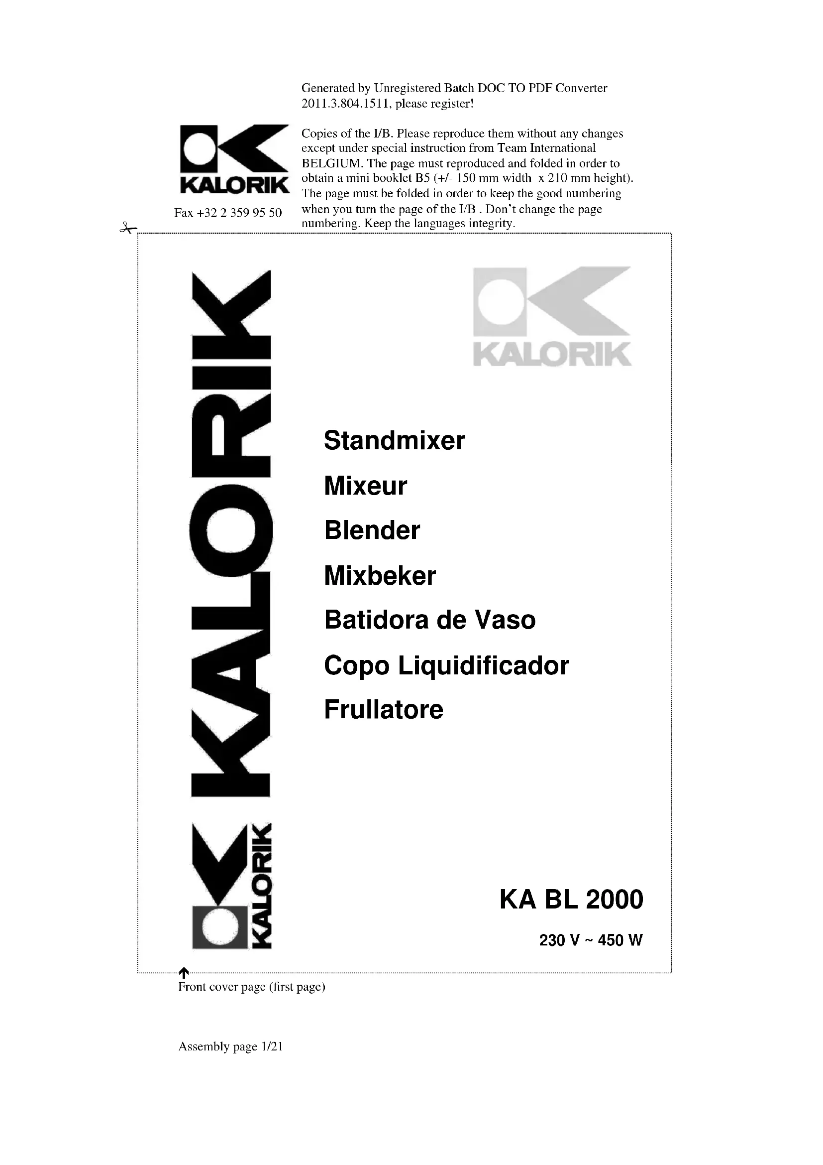 Cet appareil ne peut être utilisé de façon professionnelle. Vous devez respecter les pauses de fonctionnement. Dans le cas contraire vous risqueriez d’endommager le moteur. Référez-vous à la plaque signalétique de votre appareil pour connaître la durée maximale d’utilisation continue (notée KB xx min. où xx est la durée maximale). Les pauses de fonctionnement doivent durer au moins 10 minutes. MONTAGE DU BLENDER ET UTILISATION (cf. Page 4) Assemblez le bol verseur sur la base moteur en le tournant jusqu’à venir en butée de sorte à placer les deux flèches de couleur rouge face à face. Soulevez verticalement le couvercle (). Mettez les ingrédients dans le bol verseur et fermez le couvercle (). Branchez l’appareil. Choisissez la vitesse de mixage à l’aide du sélecteur situé sur la base moteur. La position 0 correspond à l’arrêt de l’appareil, la position 1 à la vitesse lente et la position 2 à la vitesse rapide. La position "P" (Pulse) est particulière car le sélecteur doit être maintenu manuellement. Cette position est en général utilisée pour piler de la glace afin d’éviter tout dommage sur les lames mais peut aussi être utilisée pour compléter un mixage. Il est possible de rajouter à tout moment des liquides ou autre ingrédients sans arrêter l’appareil (). Il suffit simplement de retirer le capuchon fermant l’ouverture du couvercle en le faisant tourner et en le soulevant verticalement. Une fois la préparation terminée, arrêtez l’appareil ( position 0 ) et débranchez la fiche de la prise de courant. Pour servir, retirez le couvercle et versez. NETTOYAGE Toujours débrancher votre appareil avant de le nettoyer. Pour un rinçage rapide du bol verseur ( entre deux préparations par exemple ), vous pouvez utiliser de l’eau claire et faire fonctionner l’appareil quelques instants. Dans ce cas, n’utilisez pas de détergent. Pour un nettoyage complet du bol verseur, retirez-le de sa base moteur et lavez l’ensemble avec de l’eau additionnée de détergent et rincer abondamment à l’eau claire. Faites sécher l’ensemble. Vous pouvez nettoyer la base moteur à l’aide un chiffon doux légèrement humide.Generated by Unregistered Batch DOC TO PDF Converter 2011.3.804.1511, please register! Copies of the I/B. Please reproduce them without any changes except under special instruction from Team International BELGIUM. The page must reproduced and folded in order to obtain a mini booklet B5 (+/- 150 mm width x 210 mm height). The page must be folded in order to keep the good numbering when you turn the page of the I/B . Don’t change the page numbering. Keep the languages integrity.