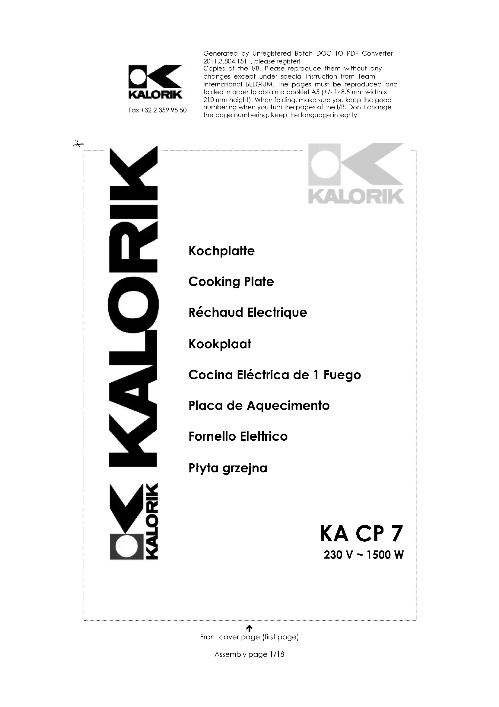 Afin de préserver notre environnement et notre santé, l‟élimination en fin de vie des appareils électriques et électroniques doit se faire selon des règles bien précises et nécessite l‟implication de chacun, qu‟il soit fournisseur ou utilisateur. C‟est pour cette raison que votre appareil, tel que le signale le symbole apposé sur sa plaque signalétique ou sur l'emballage, ne doit en aucun cas être jeté dans une poubelle publique ou privée destinée aux ordures ménagères. L'utilisateur a le droit de déposer l'appareil gratuitement dans des lieux publics de collecte procédant à un tri sélectif des déchets pour être soit recyclé, soit réutilisé pour d‟autres applications conformément à la directive. Copies of the I/B. Please reproduce them without any changes except under special instruction from Team International BELGIUM. The pages must be reproduced and folded in order to obtain a booklet A5 (+/- 148.5 mm width x 210 mm height). When folding, make sure you keep the good numbering when you turn the pages of the I/B. Don‟t change the page numbering. Keep the language integrity. 8 KA CP 7 - 070724