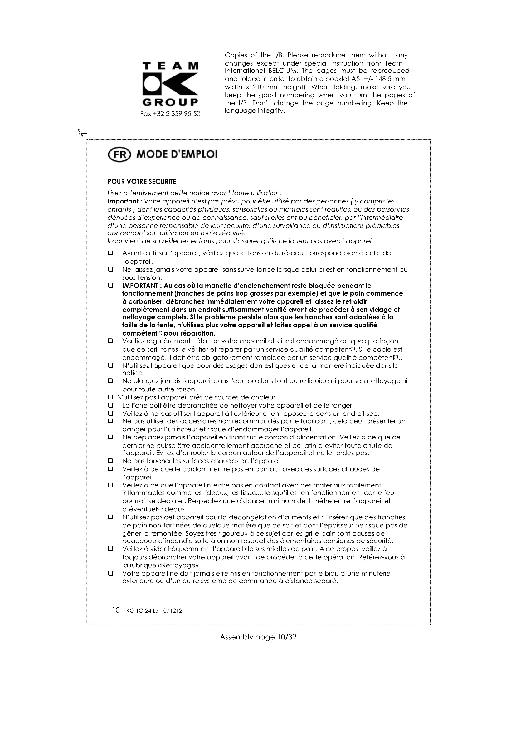 N’utilisez l'appareil que pour des usages domestiques et de la manière indiquée dans la notice. Ne plongez jamais l'appareil dans l'eau ou dans tout autre liquide ni pour son nettoyage ni pour toute autre raison. N'utilisez pas l'appareil près de sources de chaleur. La fiche doit être débranchée de nettoyer votre appareil et de le ranger. Veillez à ne pas utiliser l'appareil à l'extérieur et entreposez-le dans un endroit sec. Ne pas utiliser des accessoires non recommandés par le fabricant, cela peut présenter un danger pour l’utilisateur et risque d’endommager l’appareil. Ne déplacez jamais l’appareil en tirant sur le cordon d’alimentation. Veillez à ce que ce dernier ne puisse être accidentellement accroché et ce, afin d’éviter toute chute de l’appareil. Evitez d’enrouler le cordon autour de l’appareil et ne le tordez pas. Ne pas toucher les surfaces chaudes de l’appareil. Veillez à ce que le cordon n’entre pas en contact avec des surfaces chaudes de l’appareil Veillez à ce que l’appareil n’entre pas en contact avec des matériaux facilement inflammables comme les rideaux, les tissus,... lorsqu’il est en fonctionnement car le feu pourrait se déclarer. Respectez une distance minimum de 1 mètre entre l’appareil et d’éventuels rideaux. N’utilisez pas cet appareil pour la décongélation d’aliments et n’insérez que des tranches de pain non-tartinées de quelque matière que ce soit et dont l’épaisseur ne risque pas de gêner la remontée. Soyez très rigoureux à ce sujet car les grille-pain sont causes de beaucoup d’incendie suite à un non-respect des élémentaires consignes de sécurité. Veillez à vider fréquemment l’appareil de ses miettes de pain. A ce propos, veillez à toujours débrancher votre appareil avant de procéder à cette opération. Référez-vous à la rubrique «Nettoyage». Votre appareil ne doit jamais être mis en fonctionnement par le biais d’une minuterie extérieure ou d’un autre système de commande à distance séparé. Copies of the I/B. Please reproduce them without any changes except under special instruction from Team International BELGIUM. The pages must be reproduced and folded in order to obtain a booklet A5 (+/- 148.5 mm width x 210 mm height). When folding, make sure you keep the good numbering when you turn the pages of the I/B. Don’t change the page numbering. Keep the language integrity.