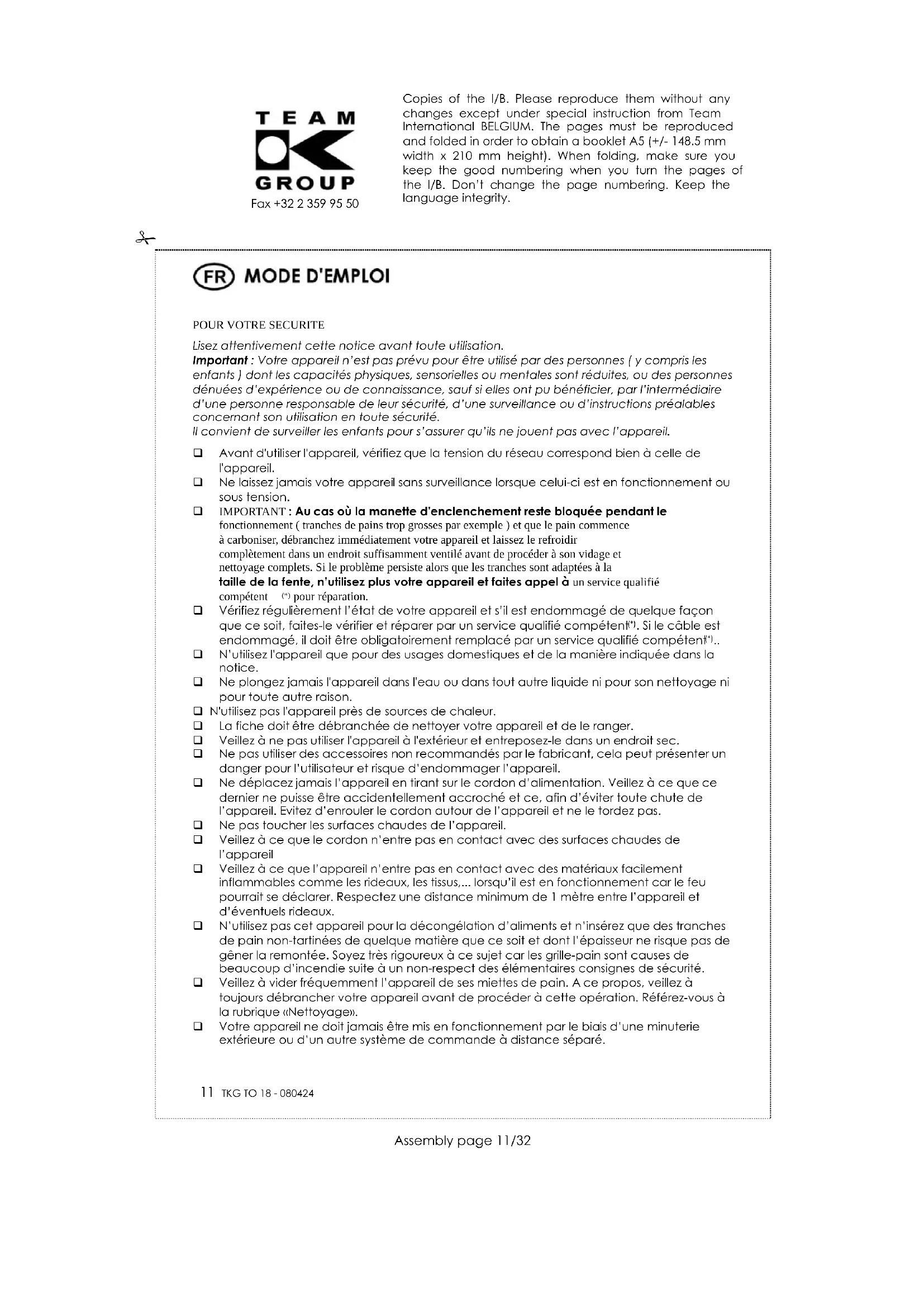 N’utilisez l'appareil que pour des usages domestiques et de la manière indiquée dans la notice. Ne plongez jamais l'appareil dans l'eau ou dans tout autre liquide ni pour son nettoyage ni pour toute autre raison. N'utilisez pas l'appareil près de sources de chaleur. La fiche doit être débranchée de nettoyer votre appareil et de le ranger. Veillez à ne pas utiliser l'appareil à l'extérieur et entreposez-le dans un endroit sec. Ne pas utiliser des accessoires non recommandés par le fabricant, cela peut présenter un danger pour l’utilisateur et risque d’endommager l’appareil. Ne déplacez jamais l’appareil en tirant sur le cordon d’alimentation. Veillez à ce que ce dernier ne puisse être accidentellement accroché et ce, afin d’éviter toute chute de l’appareil. Evitez d’enrouler le cordon autour de l’appareil et ne le tordez pas. Ne pas toucher les surfaces chaudes de l’appareil. Veillez à ce que le cordon n’entre pas en contact avec des surfaces chaudes de l’appareil Veillez à ce que l’appareil n’entre pas en contact avec des matériaux facilement inflammables comme les rideaux, les tissus,... lorsqu’il est en fonctionnement car le feu pourrait se déclarer. Respectez une distance minimum de 1 mètre entre l’appareil et d’éventuels rideaux. N’utilisez pas cet appareil pour la décongélation d’aliments et n’insérez que des tranches de pain non-tartinées de quelque matière que ce soit et dont l’épaisseur ne risque pas de gêner la remontée. Soyez très rigoureux à ce sujet car les grille-pain sont causes de beaucoup d’incendie suite à un non-respect des élémentaires consignes de sécurité. Veillez à vider fréquemment l’appareil de ses miettes de pain. A ce propos, veillez à toujours débrancher votre appareil avant de procéder à cette opération. Référez-vous à la rubrique «Nettoyage». Votre appareil ne doit jamais être mis en fonctionnement par le biais d’une minuterie extérieure ou d’un autre système de commande à distance séparé. Copies of the I/B. Please reproduce them without any changes except under special instruction from Team International BELGIUM. The pages must be reproduced and folded in order to obtain a booklet A5 (+/- 148.5 mm width x 210 mm height). When folding, make sure you keep the good numbering when you turn the pages of the I/B. Don’t change the page numbering. Keep the language integrity.