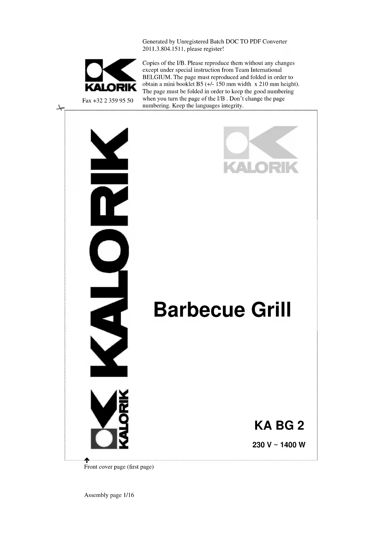Avant de nettoyer tout appareil électrique, retirer d'abord la prise. Laisser refroidir le gril avant le nettoyage. Ne jamais immerger le gril ou la fiche dans l'eau! Nettoyer le bac à eau et la grille de l'appareil dans l'eau chaude en y ajoutant un détergent doux si nécessaire, puis les sécher. Nettoyer les surfaces extérieures du gril avec un chiffon légèrement humide et puis les sécher. Ne pas utiliser des détergents agressifs.Generated by Unregistered Batch DOC TO PDF Converter 2011.3.804.1511, please register! Copies of the I/B. Please reproduce them without any changes except under special instruction from Team International BELGIUM. The page must reproduced and folded in order to obtain a mini booklet B5 (+/- 150 mm width x 210 mm height). The page must be folded in order to keep the good numbering when you turn the page of the I/B . Don’t change the page numbering. Keep the languages integrity.
