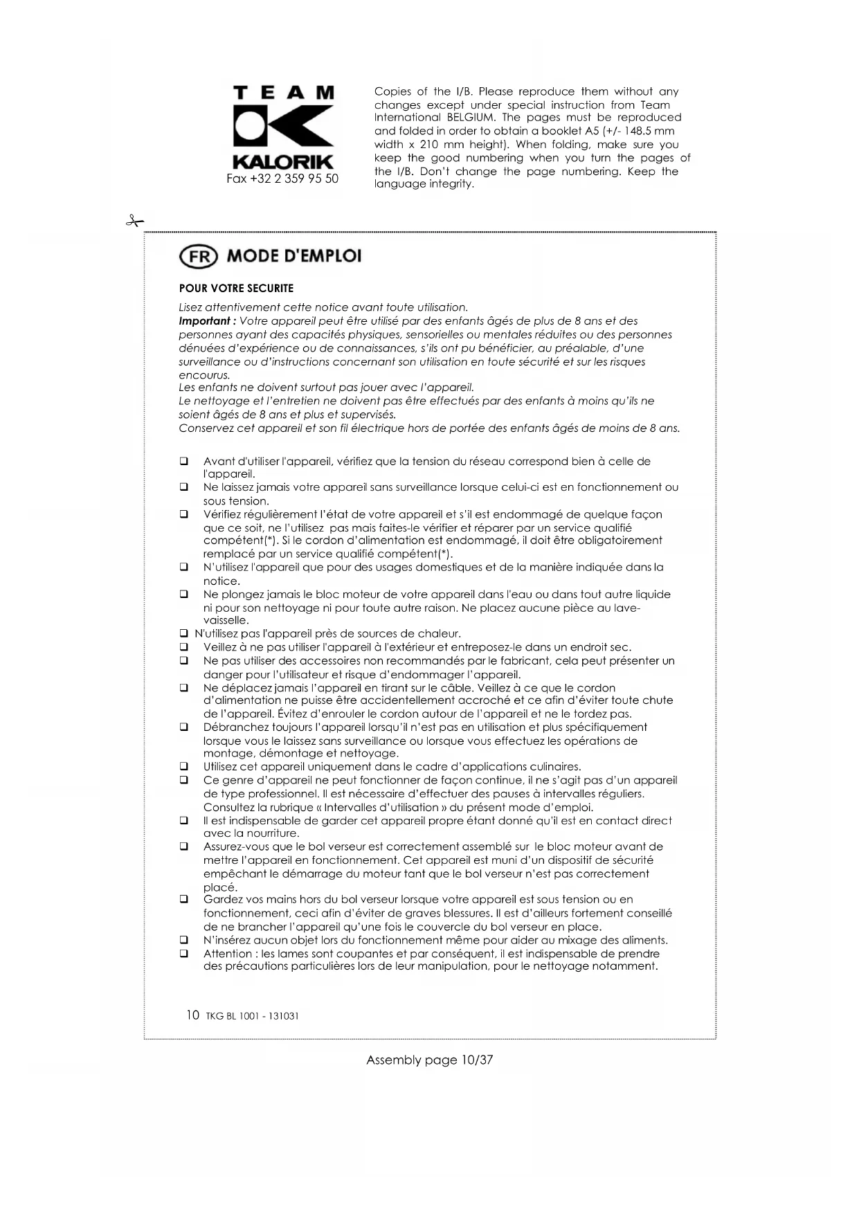 Avant d'utiliser l'appareil, vérifiez que la tension du réseau correspond bien à celle de l'appareil. Ne laissez jamais votre appareil sans surveillance lorsque celui-ci est en fonctionnement ou sous tension. Vérifiez régulièrement l’état de votre appareil et s’il est endommagé de quelque façon que ce soit, ne l’utilisez pas mais faites-le vérifier et réparer par un service qualifié compétent(*). Si le cordon d’alimentation est endommagé, il doit être obligatoirement remplacé par un service qualifié compétent(*). N’utilisez l'appareil que pour des usages domestiques et de la manière indiquée dans la notice. Ne plongez jamais le bloc moteur de votre appareil dans l'eau ou dans tout autre liquide ni pour son nettoyage ni pour toute autre raison. Ne placez aucune pièce au lave- vaisselle. N'utilisez pas l'appareil près de sources de chaleur. Veillez à ne pas utiliser l'appareil à l'extérieur et entreposez-le dans un endroit sec. Ne pas utiliser des accessoires non recommandés par le fabricant, cela peut présenter un danger pour l’utilisateur et risque d’endommager l’appareil. Ne déplacez jamais l’appareil en tirant sur le câble. Veillez à ce que le cordon d’alimentation ne puisse être accidentellement accroché et ce afin d’éviter toute chute de l’appareil. Évitez d’enrouler le cordon autour de l’appareil et ne le tordez pas. Débranchez toujours l’appareil lorsqu’il n’est pas en utilisation et plus spécifiquement lorsque vous le laissez sans surveillance ou lorsque vous effectuez les opérations de montage, démontage et nettoyage. Utilisez cet appareil uniquement dans le cadre d’applications culinaires. Ce genre d’appareil ne peut fonctionner de façon continue, il ne s’agit pas d’un appareil de type professionnel. Il est nécessaire d’effectuer des pauses à intervalles réguliers. Consultez la rubrique « Intervalles d’utilisation » du présent mode d’emploi. Il est indispensable de garder cet appareil propre étant donné qu’il est en contact direct avec la nourriture. Assurez-vous que le bol verseur est correctement assemblé sur le bloc moteur avant de mettre l’appareil en fonctionnement. Cet appareil est muni d’un dispositif de sécurité empêchant le démarrage du moteur tant que le bol verseur n’est pas correctement placé. Gardez vos mains hors du bol verseur lorsque votre appareil est sous tension ou en fonctionnement, ceci afin d’éviter de graves blessures. Il est d’ailleurs fortement conseillé de ne brancher l’appareil qu’une fois le couvercle du bol verseur en place. N’insérez aucun objet lors du fonctionnement même pour aider au mixage des aliments. Attention : les lames sont coupantes et par conséquent, il est indispensable de prendre des précautions particulières lors de leur manipulation, pour le nettoyage notamment. Copies of the I/B. Please reproduce them without any changes except under special instruction from Team International BELGIUM. The pages must be reproduced and folded in order to obtain a booklet A5 (+/- 148.5 mm width x 210 mm height). When folding, make sure you keep the good numbering when you turn the pages of the I/B. Don’t change the page numbering. Keep the language integrity.