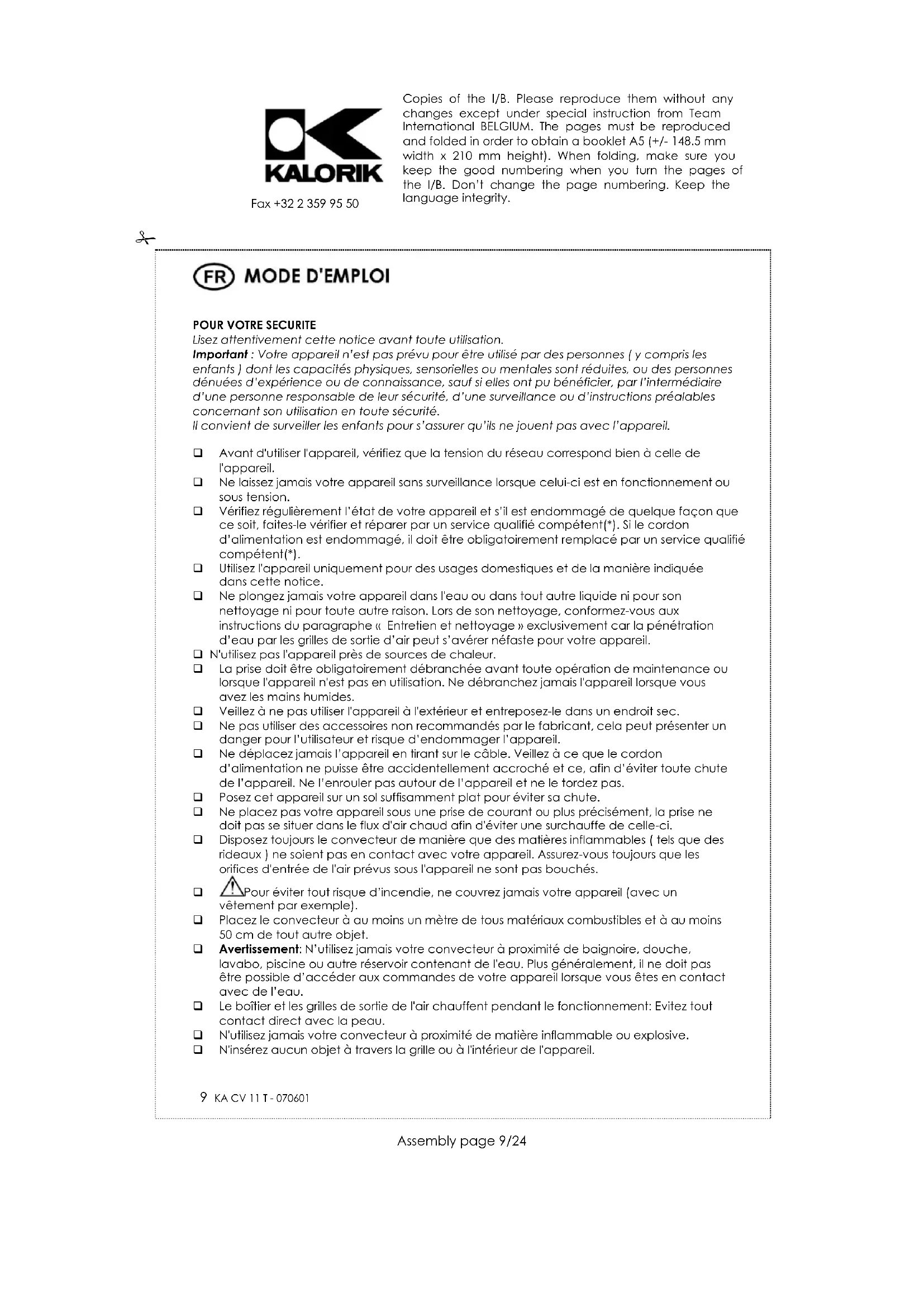 lavabo, piscine ou autre réservoir contenant de l'eau. Plus généralement, il ne doit pas être possible d’accéder aux commandes de votre appareil lorsque vous êtes en contact avec de l’eau. Le boîtier et les grilles de sortie de l'air chauffent pendant le fonctionnement: Evitez tout contact direct avec la peau. N'utilisez jamais votre convecteur à proximité de matière inflammable ou explosive. N'insérez aucun objet à travers la grille ou à l'intérieur de l'appareil. Copies of the I/B. Please reproduce them without any changes except under special instruction from Team International BELGIUM. The pages must be reproduced and folded in order to obtain a booklet A5 (+/- 148.5 mm width x 210 mm height). When folding, make sure you keep the good numbering when you turn the pages of the I/B. Don’t change the page numbering. Keep the language integrity. 10 KA CV 11 T - 070601