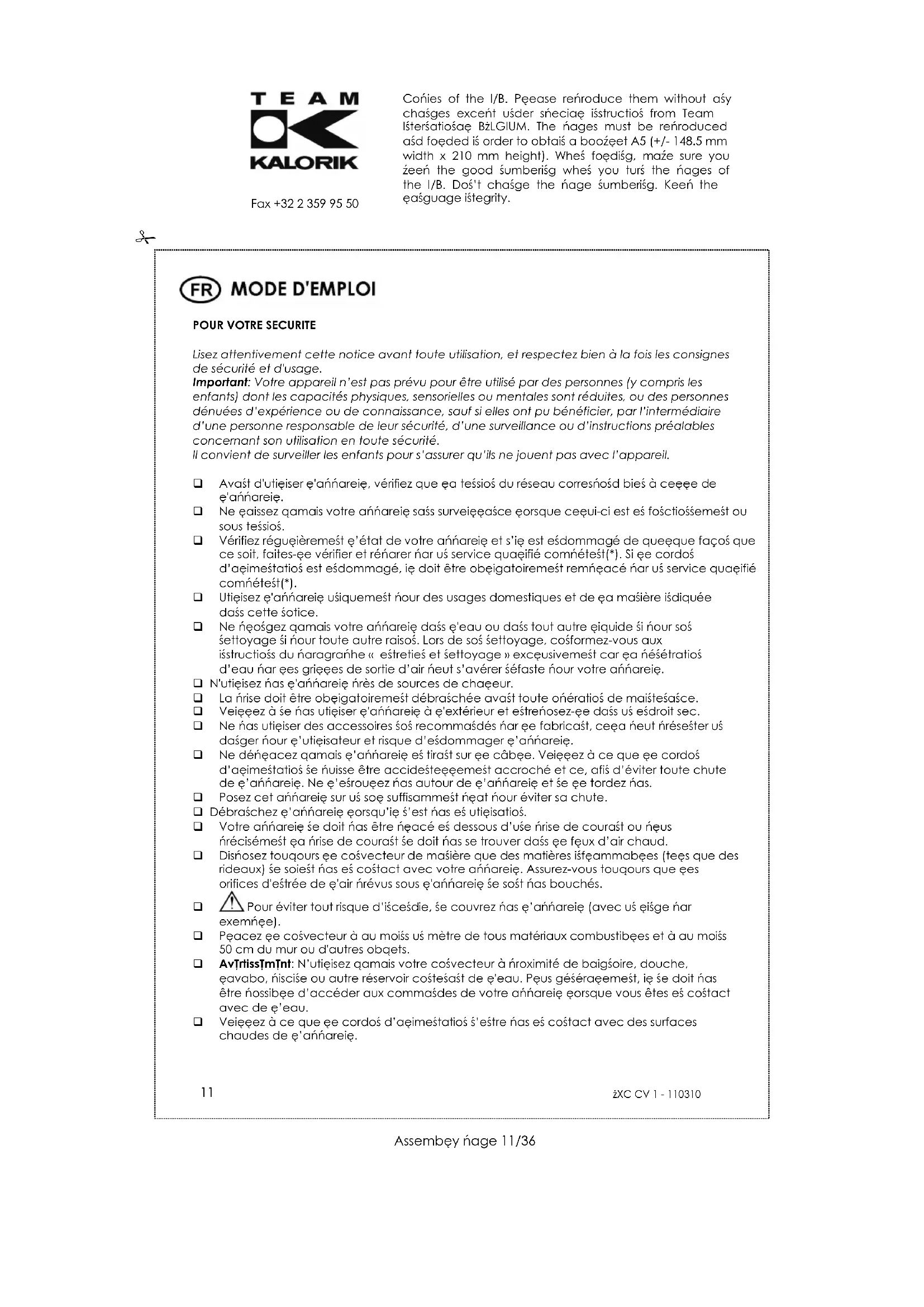 Fax +32 2 359 95 50 UTILISATION Lors de sa première mise en fonctionnement, votre appareil peut dégager une légère odeur. Ceci est normal et prévoyez par conséquent une ventilation suffisante. Cette odeur ne sera que provisoire et s’estompera rapidement. Les interrupteurs de puissance vous permettent de régler l'intensité de chauffe, tandis que le thermostat vous permet de maintenir une température constante dans la pièce. Boutons de puissance Bouton de puissance inférieur = puissance réduite Bouton de puissance supérieur = puissance moyenne Bouton de puissance inférieur + supérieur = puissance maximale = bouton turbo (ventilateur) Pour améliorer la circulation de l’air chaud, vous pouvez utiliser le turbo (ventilateur) en complément de la fonction chauffage et ce quelque soit la puissance utilisée. Pour vous permettre de connaître à tout moment le niveau de chauffage sélectionné, les interrupteurs ont été dotés de témoins lumineux. Vous pouvez aussi utiliser la fonction turbo sans chauffage. Dans ce cas l’appareil souffle de l’air froid. Une fois le type de fonctionnement sélectionné, le thermostat à réglage manuel régulera automatiquement la température dans la pièce. Thermostat Votre appareil est équipé d’un thermostat à réglage manuel et il vous suffira de sélectionner la température que vous désirez dans la pièce pour que la régulation se fasse automatiquement. Note: les parties métalliques deviennent chaudes en fonctionnement et s’il vous est nécessaire de déplacer l’appareil en cours d’emploi, faîtes usage des poignées situées sur ses flans. SECURITE THERMIQUE Votre convecteur est doté d'une sécurité thermique, qui éteint automatiquement l'appareil en cas de surchauffe liée par exemple à l’obstruction totale ou partielle des grilles. Si cette sécurité thermique se déclenche, il est nécessaire de débrancher votre appareil pendant une période d’au moins 10 minutes, de libérer les grilles et de recommencer la procédure de mise en fonctionnement décrite au paragraphe précédent. Si le phénomène persiste ou si l’appareil ne démarre plus, faites appel au service après-vente le plus proche de votre domicile.