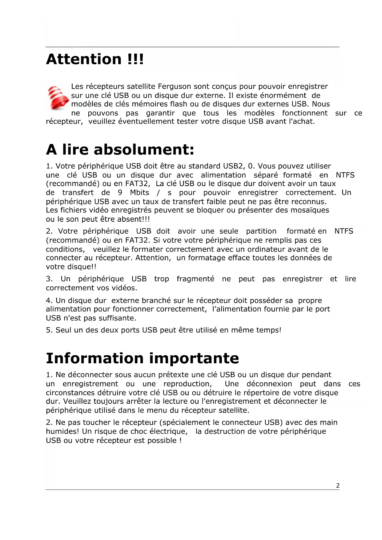 - Ne déconnecter sousaucen prétexte une clé USB ou un disque dur pendant un enregistrement ou une reproduction,Une déconnexion peut dans ces circonstances détruire vosere clé USB ou ou détruire le repertoire de votre disque dur.Veuillez toujours arreter la lecture ou l'enregistrement et déconnecter le péripérisqueutilisédansle menu du récepteur satellite.