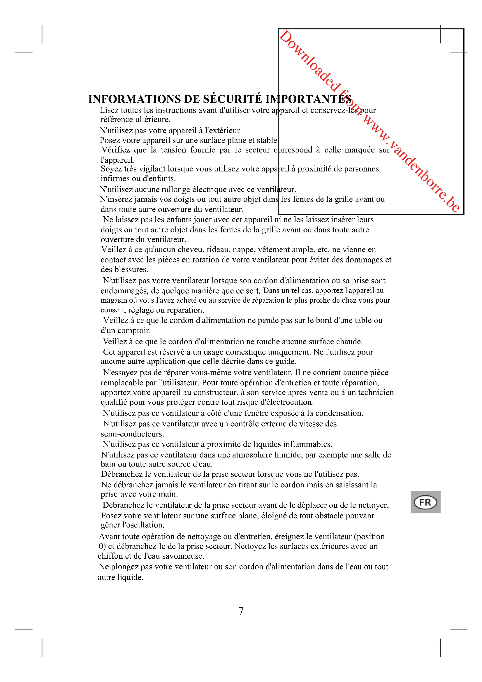 Nettoyez les surfaces extérieures avec un chiffon et de l'eau savonneuse. Une fois que le ventilateur est assemblé, il est interdit de démonter les grilles.Downloaded from www.vandenborre.be Essuyez l'extérieur avec un chiffon légèrement humide. Ne plongez pas le bloc-moteur dans l'eau ou tout autre liquide. N'utilisez ni produit fortement abrasif ni solvant ni détergent chimique ni de l'essence ni tout autre produit similaire pour ne pas endommager les éléments en plastique. Si vous n'utilisez pas votre ventilateur, rangez-le dans un endroit sec où il ne risque pas d'être abîmé. SPÉCIFICATIONS 220-240V~ 50Hz 60W